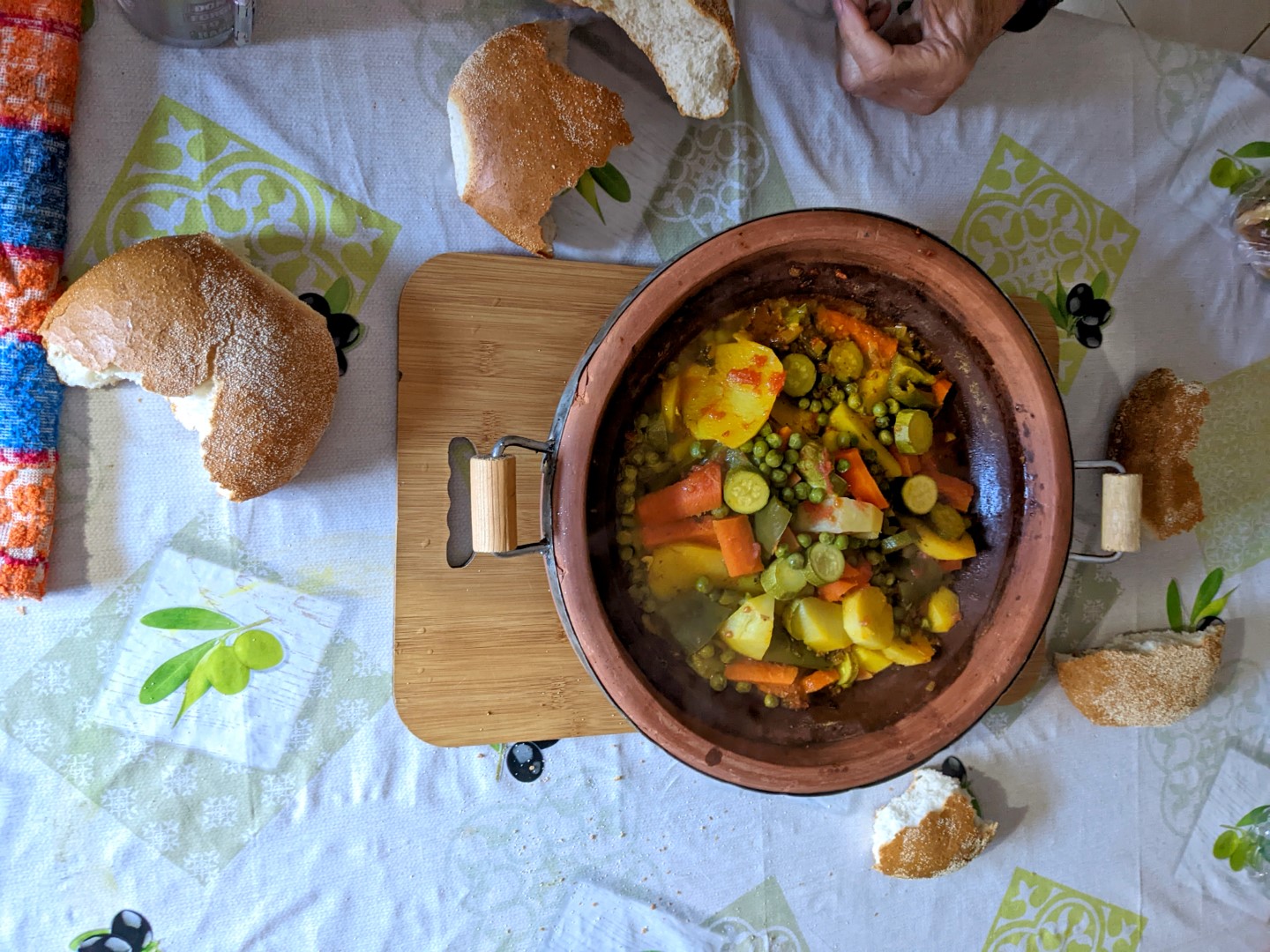 The kitchen was well-equipped and spacious enough for all of us to be preparing meals at once — which often happened. On Friday, the housekeeper made lunch for all of us, which she cooked in a tajine (one of those conical clay cooking pots we’ve been seeing everywhere). It was, we learned, a tradition to have this communal couscous every Friday at the school. This one, which we were able to watch being prepared, was quite tasty, with plenty of vegetables. (There was also chicken on the bottom, which we easily could avoid. ) The cook, evidently abstaining from Ramadan fasting, dug in with the rest of us — literally dug in, deftly, in Moroccan fashion, with her fingertips.