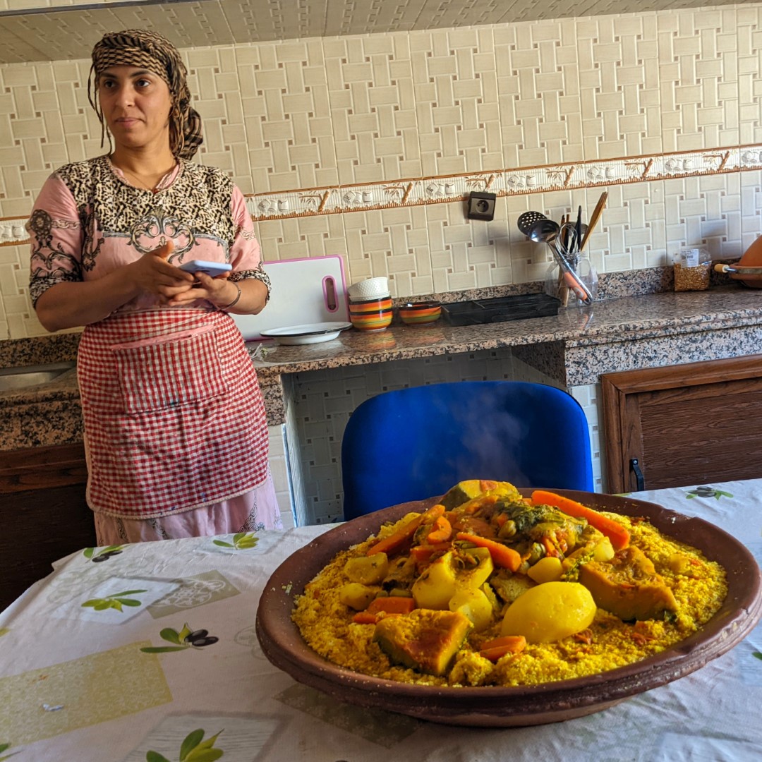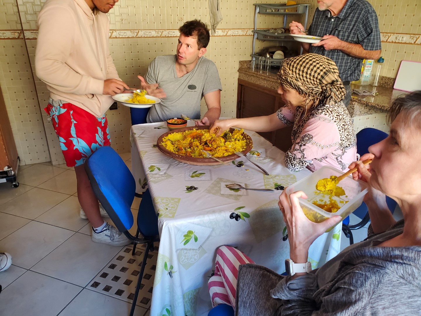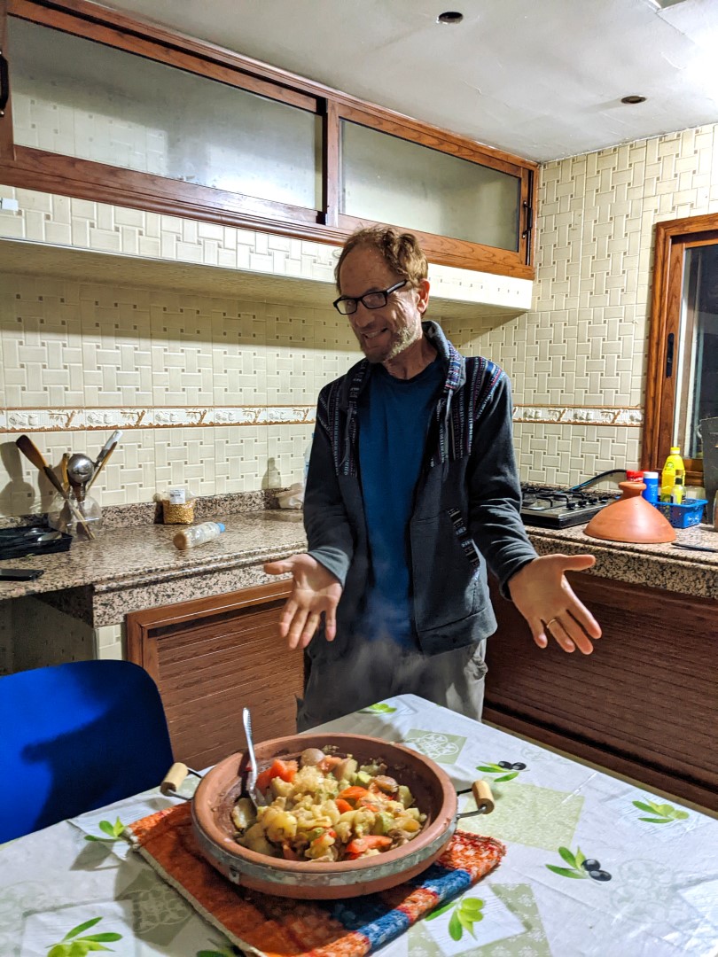 Before they left, however, we had one more communal feast of couscous etc. prepared by the housekeeper in the tajine. And Dennis tried his own hand at cooking with the tajine, with results that were not at all disastrous.