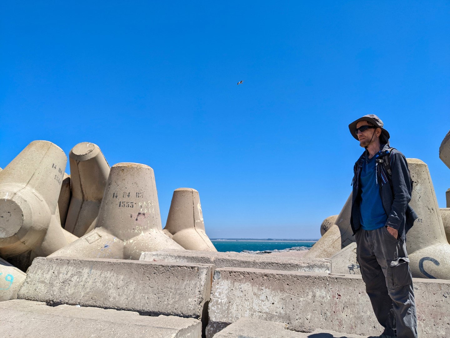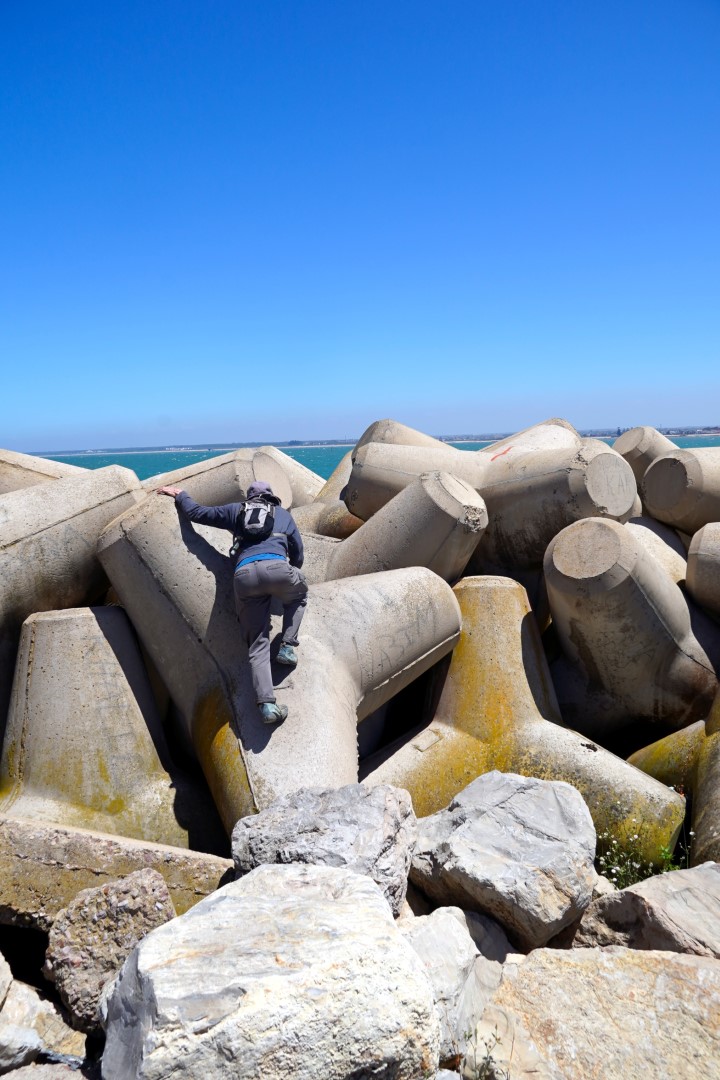 So we settled in for 3 days in residence at the El Jadida campus. During that time, our schedule was busy at some times, but still left us plenty of time to get out and explore. We went back to the Sixteenth Century Mazagan Fortress, the walled fortification at the seashore. And we walked along the breakwater, where a few guys were jumping off into the water despite the presence of some rather treacherous-looking rocks below. The breakwater was built up in some places by stacks of what resembled giant concrete jacks (the kind you play a game with) – a rather clever design that is symmetrical in all directions.