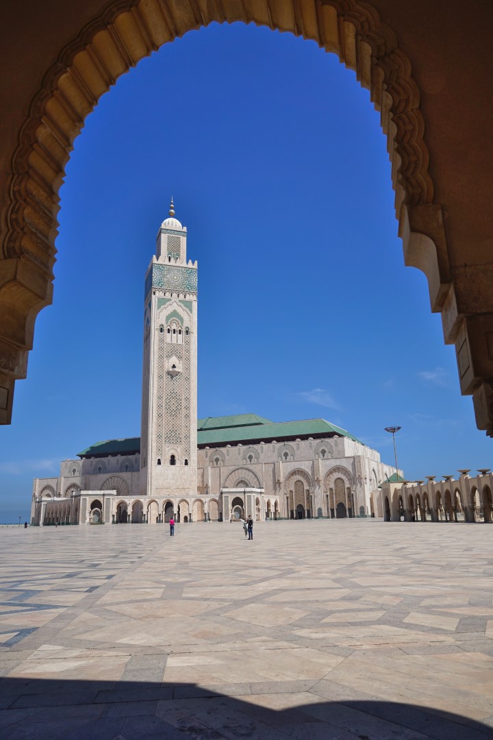 Our next stop was what is probably Casablanca’s finest architectural achievement, even though it isn’t very old (only about 30 years, though it looks older): the Hassan II Mosque, the largest mosque in Morocco and the seventh-largest in the world. Its minaret, the second-tallest in the world at 689 feet, towers above the shoreline like a lighthouse (which it sort of is, with a laser beam pointed toward Mecca), but with the splendor of the Colossus of Rhodes. We took a peek inside the lobby, but there is a charge for touring, and the outlander rate is exactly double what the locals pay, so we decided to pass. In our experience, mosques are more interesting on the outside than on the inside, anyway.
