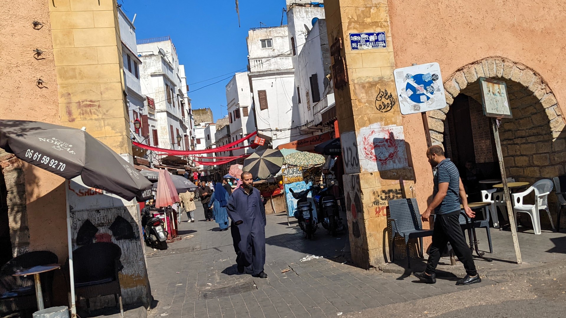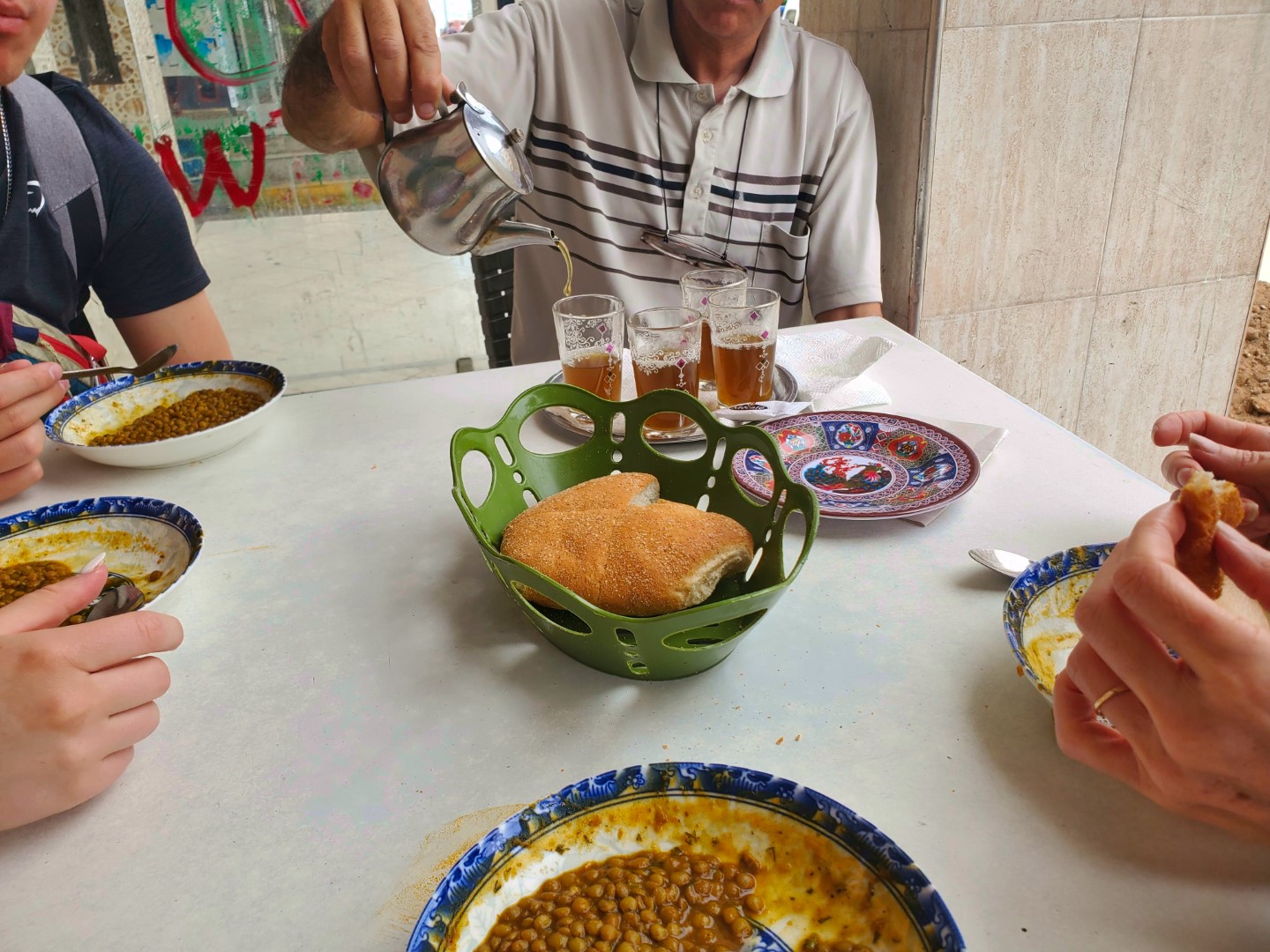 Although the downtown campus of the language school was only a short walk from our apartment, that was not where we were assigned, at least not at first. Instead, we were going to a busier branch, a few miles away. This required walking a few blocks to catch a metro, and riding it about half an hour, then getting off and being picked up by Khalil, who drove us the rest of the way. On the first day, before taking us on to the school, he stopped at a little outdoor restaurant and treated us to a tasty lunch of hearty lentil stew and bread. And the obligatory Moroccan tea, which he served to us by holding the pot up high as he poured, a Moroccan gesture of respect.
