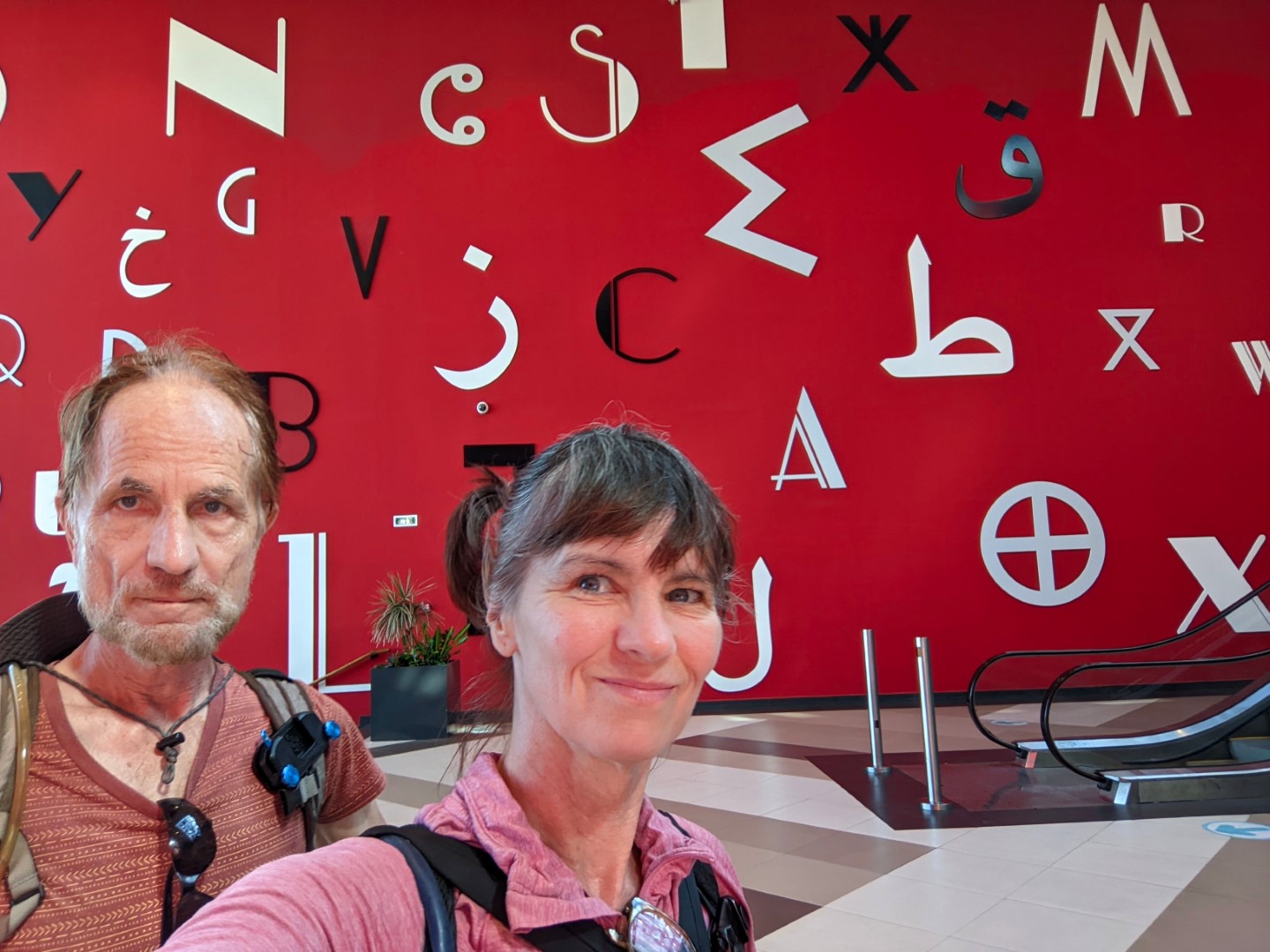 In the mall was a sporting/ outdoorsy store somewhat like REI. Here we found some backpacks that struck our fancy – not the omnibus mule packs we wear on our backs when we are in transit, but smaller ones to wear in front. We already had one of these for each of us – one holds electronic gear and the other holds food and related items – but they both leave something to be desired, so we’d been seeking suitable replacements for some time. It’s tricky to find bags that are large enough to carry what we need carried in them, yet compact enough to fit under an airplane seat – these bags are always carry-ons. But these two seemed to fill the bill, so we bought them. But once we got them home, we finally came to the conclusion that they wouldn’t work out after all. So the next day we returned them.