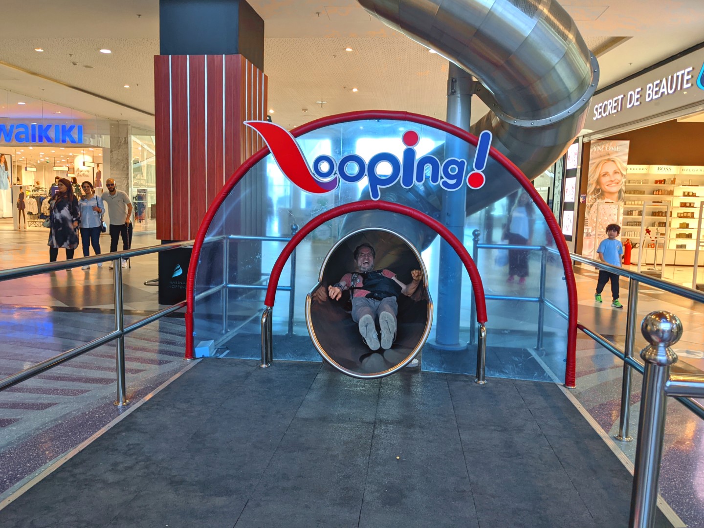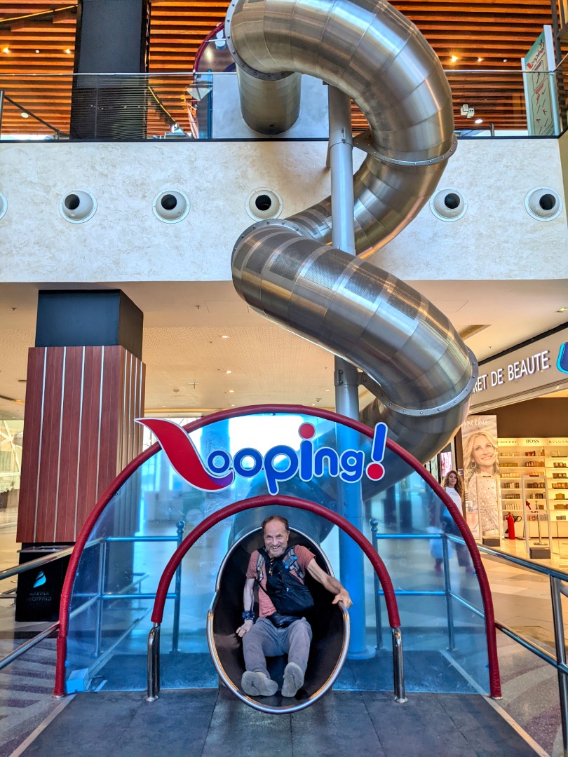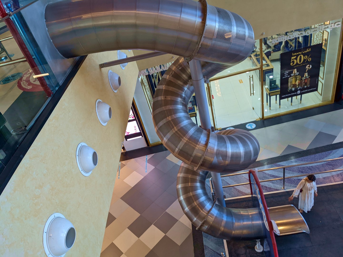 Not finding all we needed/ sought/ craved in the marketplace, we ended up at yet another in a series of malls we’ve found ourselves resorting to in the countries we’ve visited. This one featured a really cool slide that you could slide on from one floor down to another, and security didn’t care if the kids who slid on it were kids in our age bracket.