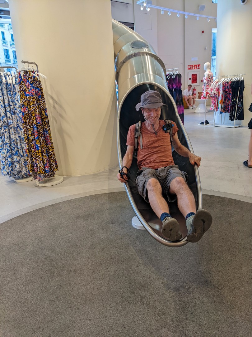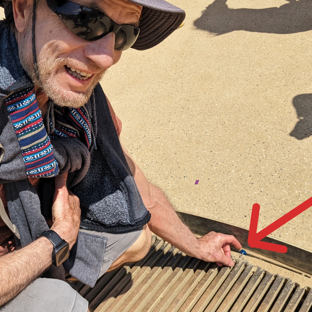 But it didn’t come to that. We just scrolled through the photos we’d taken of ourselves until we found the most recent one with the mount intact. Then we went back to that location — which was not far — and retraced our steps from there. Finally we found the screw just a few feet from where we’d discovered it missing. At first, we’d overlooked it because it had rolled or been kicked up against the edge of the sidewalk. And it was next to a grating, so it easily could have fallen in, and been lost like Clementine.