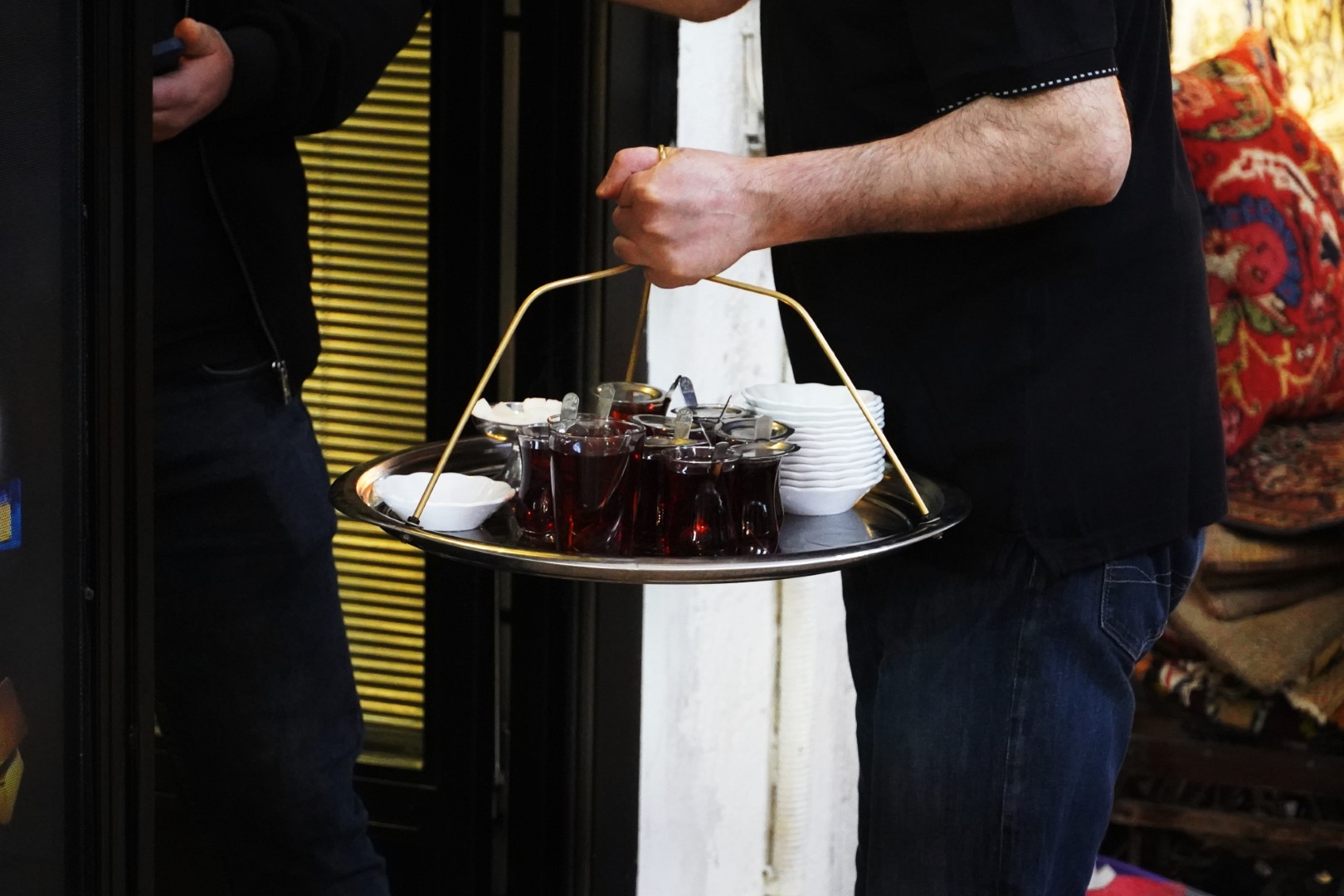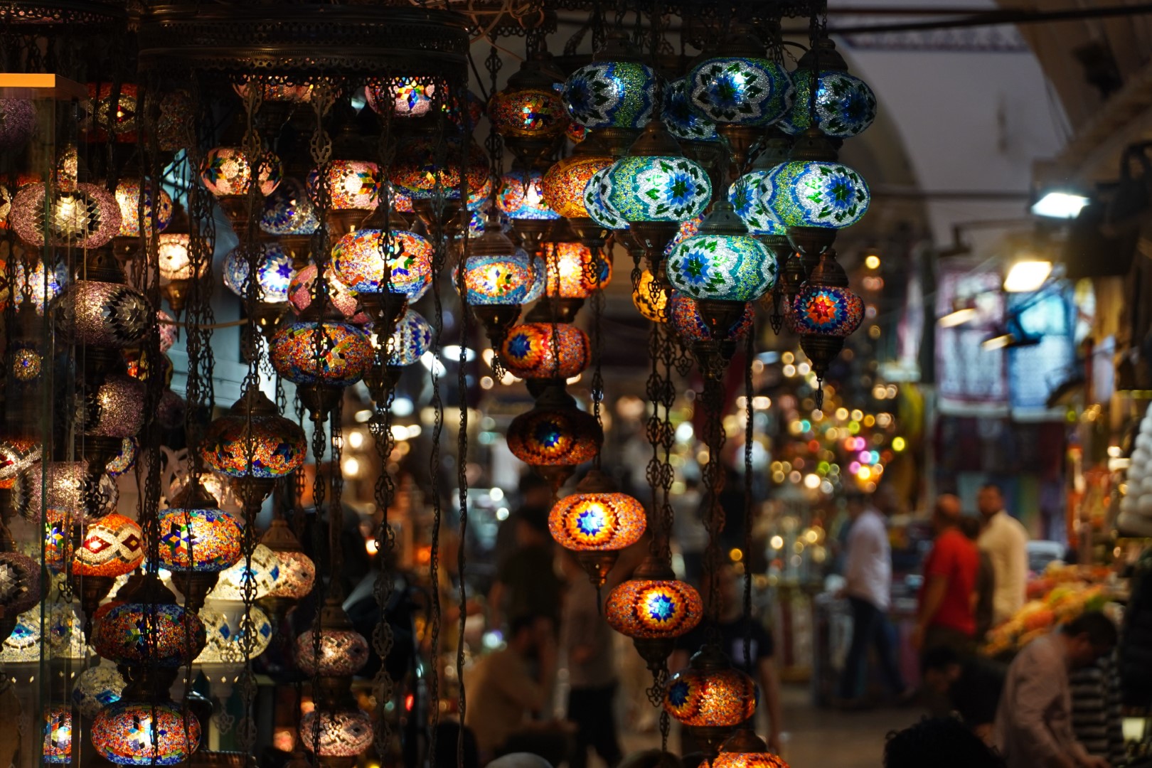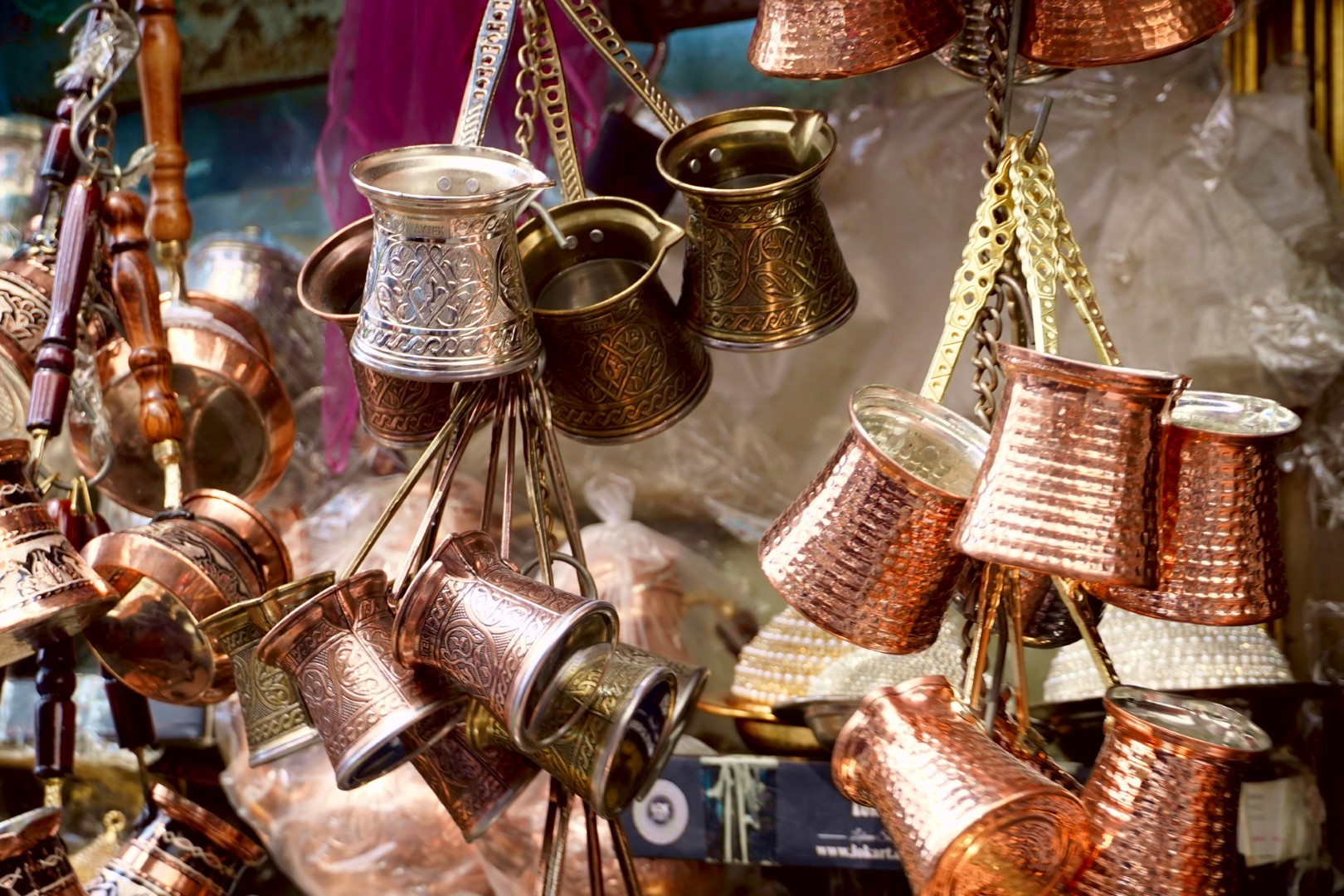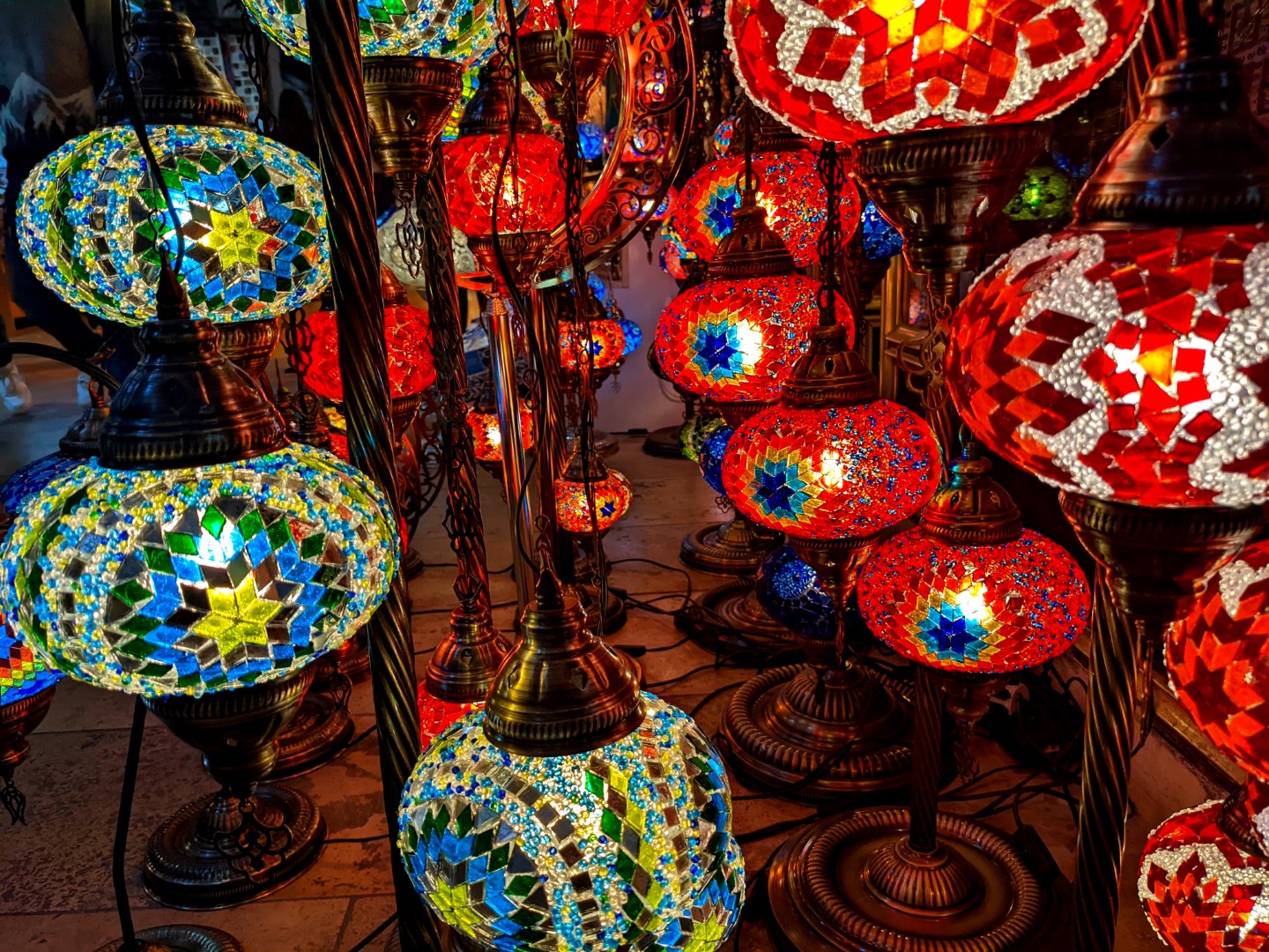 Our first point of interest to hit was the Grand Bazaar, which we actually found to be a bit of a letdown after all its hype. It is indeed an impressively enormous marketplace, but to us it seemed a bit too modernized and sanitized. We were hoping to would be something more on the order of the souqs we frequented in Morocco, existing mostly to supply the needs of locals; instead, it definitely caters to tourists, and is therefore little more than a mall. But there were some traditional touches, including the vendors of hot Turkish tea served in tulip-shaped glasses, and carried on a round tray suspended from three chains (the vendors we saw, though, used a more stabilized tray that substituted metal rods for chains, which seems to be the modern innovation).