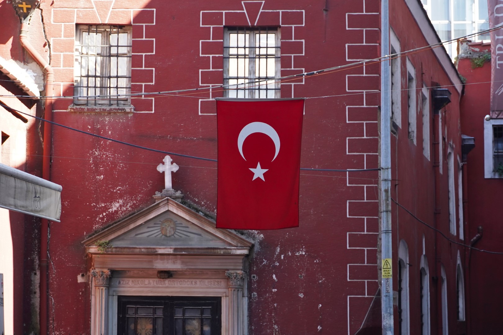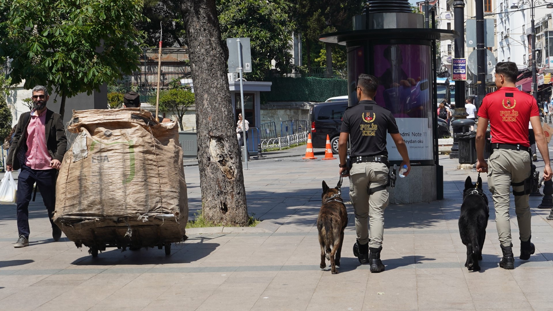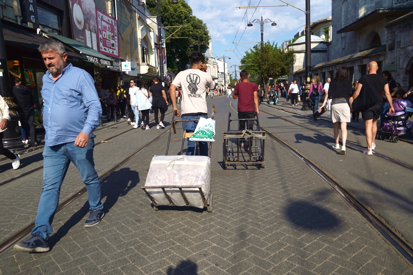 There was no attendant on duty, but there were a couple of policemen keeping tabs, with whom we managed to communicate in gestures and fragments of mangled Turkish. They were friendly and helpful — one of them even whipped out his wallet and tried to make change for us. Finally, however, we understood the system so that we could use our bus tickets (which still had money on them) for train fare, and even get a refund for unused portions at some stations. So then we caught a train into the historic district, got off, and walked a few blocks to the hostel where we’d be staying.