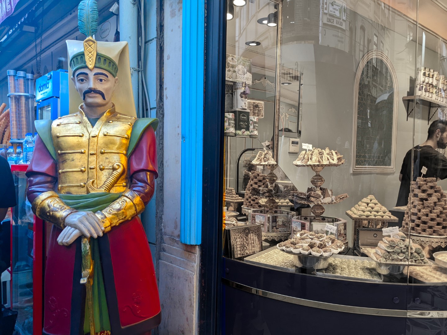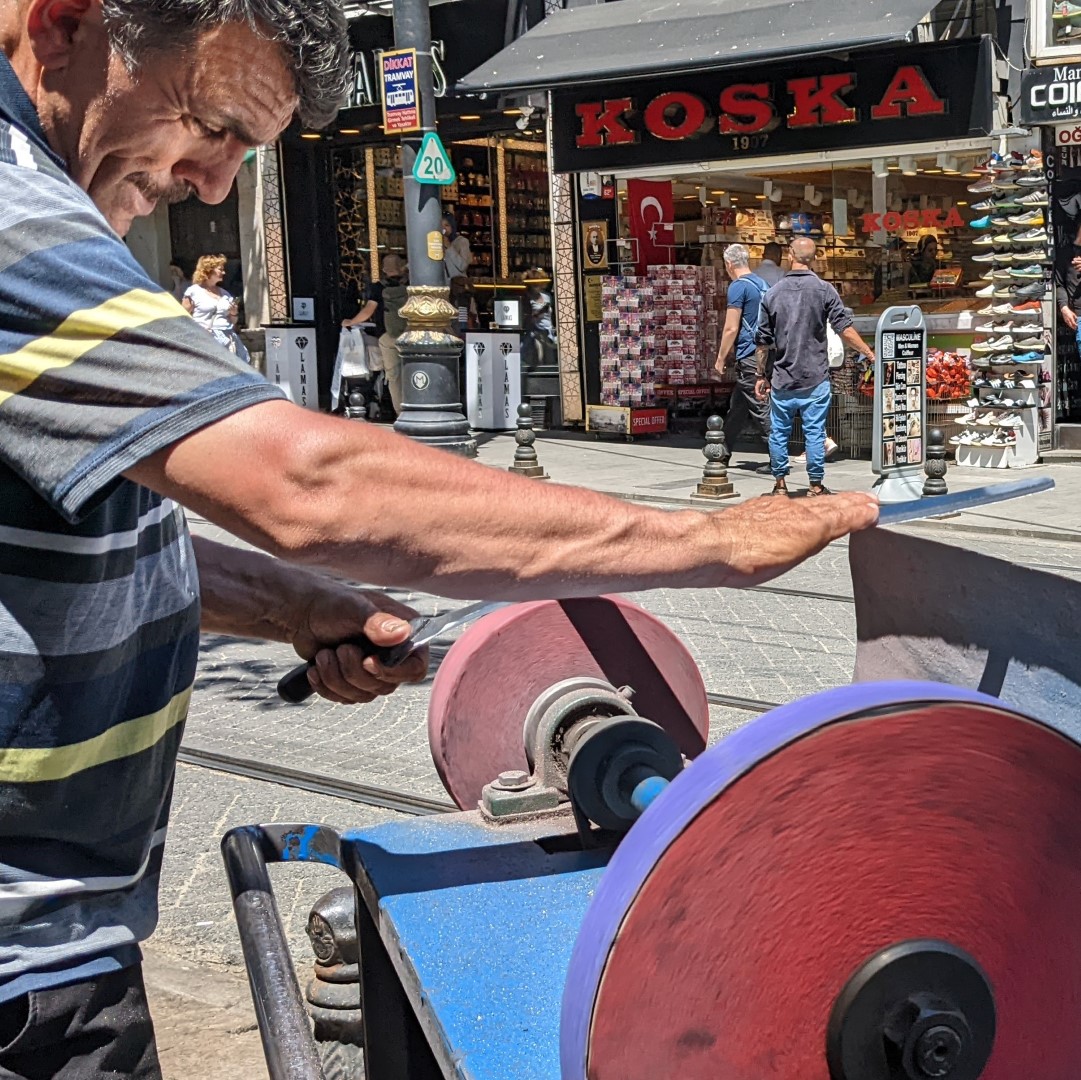 One culinary treat that was absolutely on our Turkish bucket list was ice cream. Turkish ice cream, to be sure, is really good. But that isn’t the only reason to buy it, or even the best reason. The real experience is watching how it’s served. Many of the ice cream vendors are skilled comics who pull all kinds of hilarious little sleight-of-hand tricks while serving your ice cream cone. It really must be seen to be appreciated. Their high jinks are assisted by the really long serving spoons they use, and the composition of the ice cream itself — it includes ingredients that make it more durable and pliable, and thus more easily manipulated. One of the vendors we patronized — and of course we had to do it more than once — pulled out, at one point in his routine, the entire chunk of one flavor from its pail rather than just a cone-sized scoop. We of course had to order pistachio flavored, since the pistachio is one of the products for which Turkey is famous — and we weren’t disappointed.