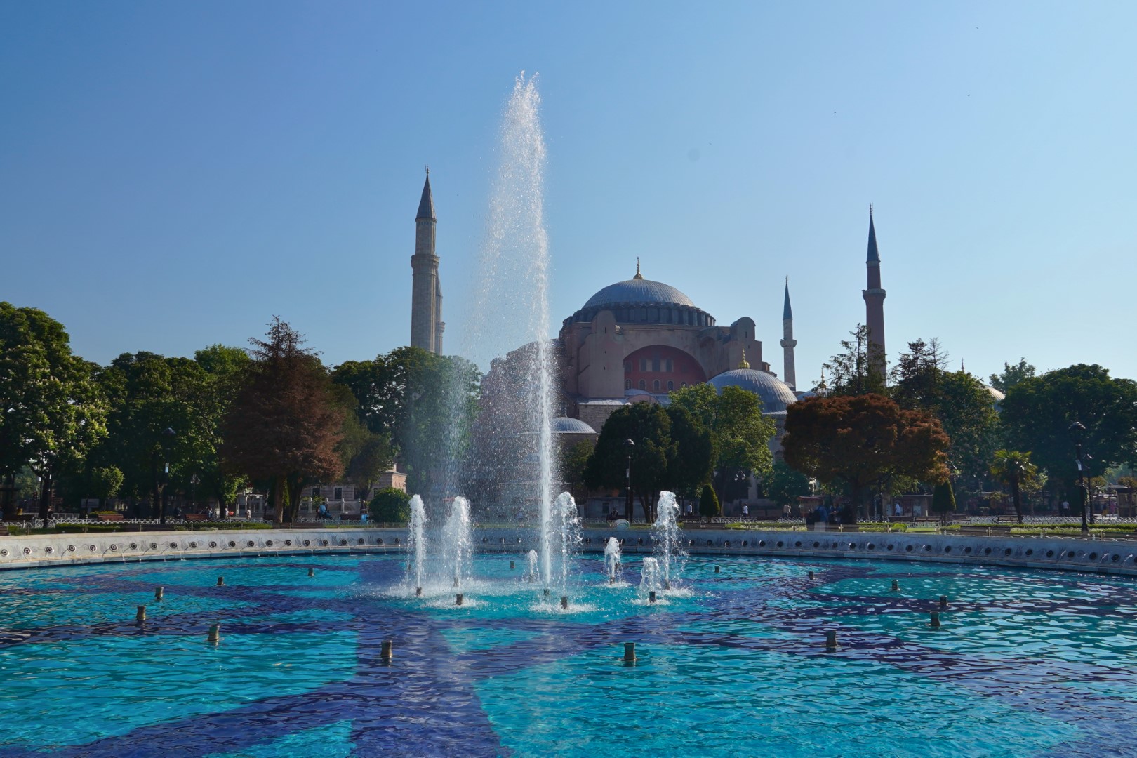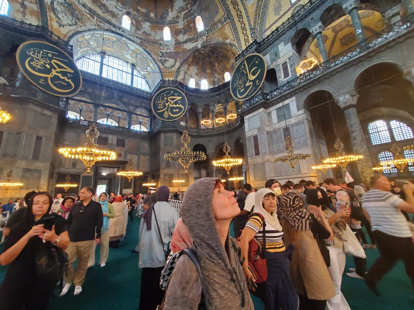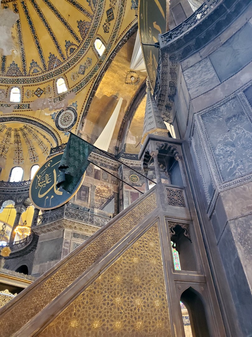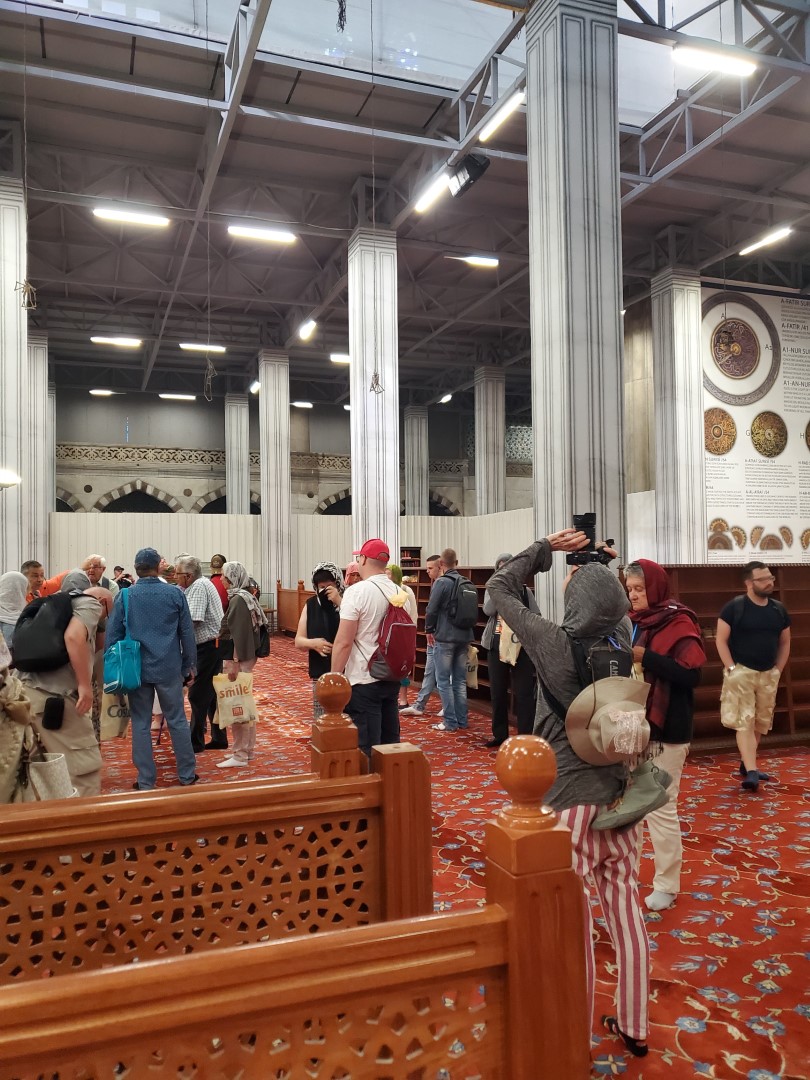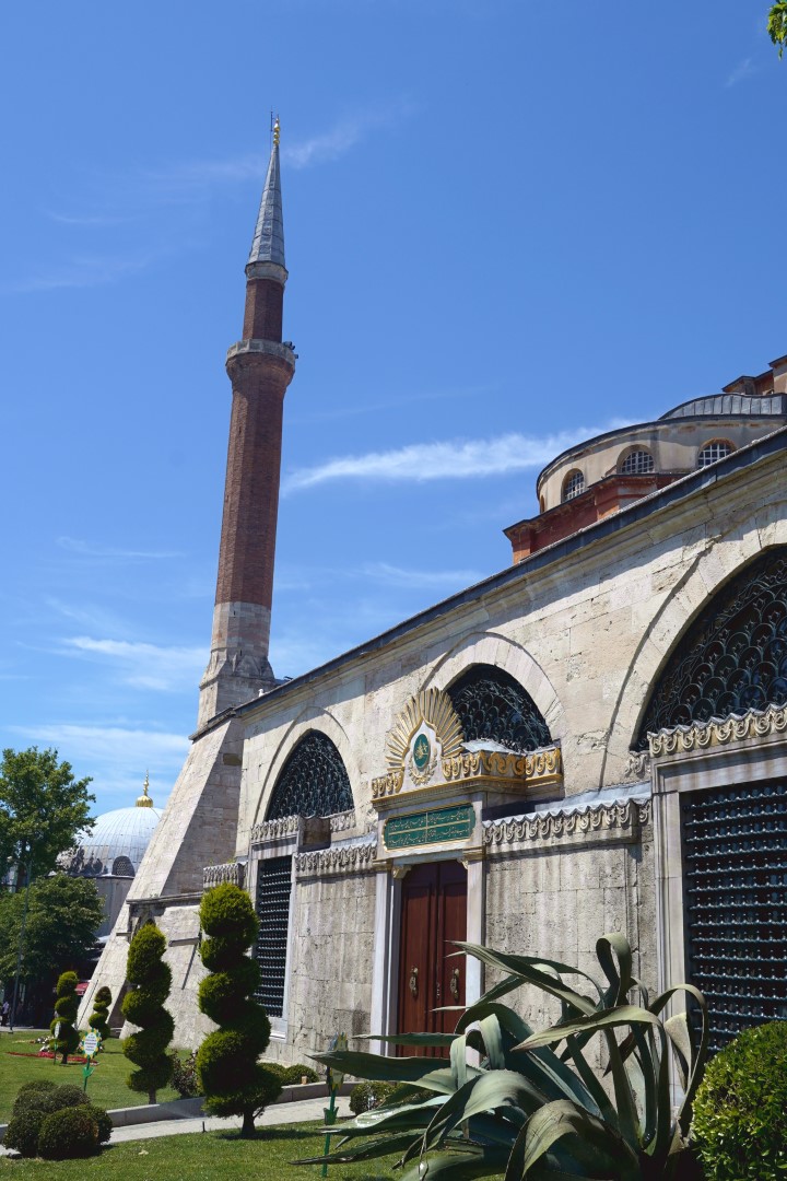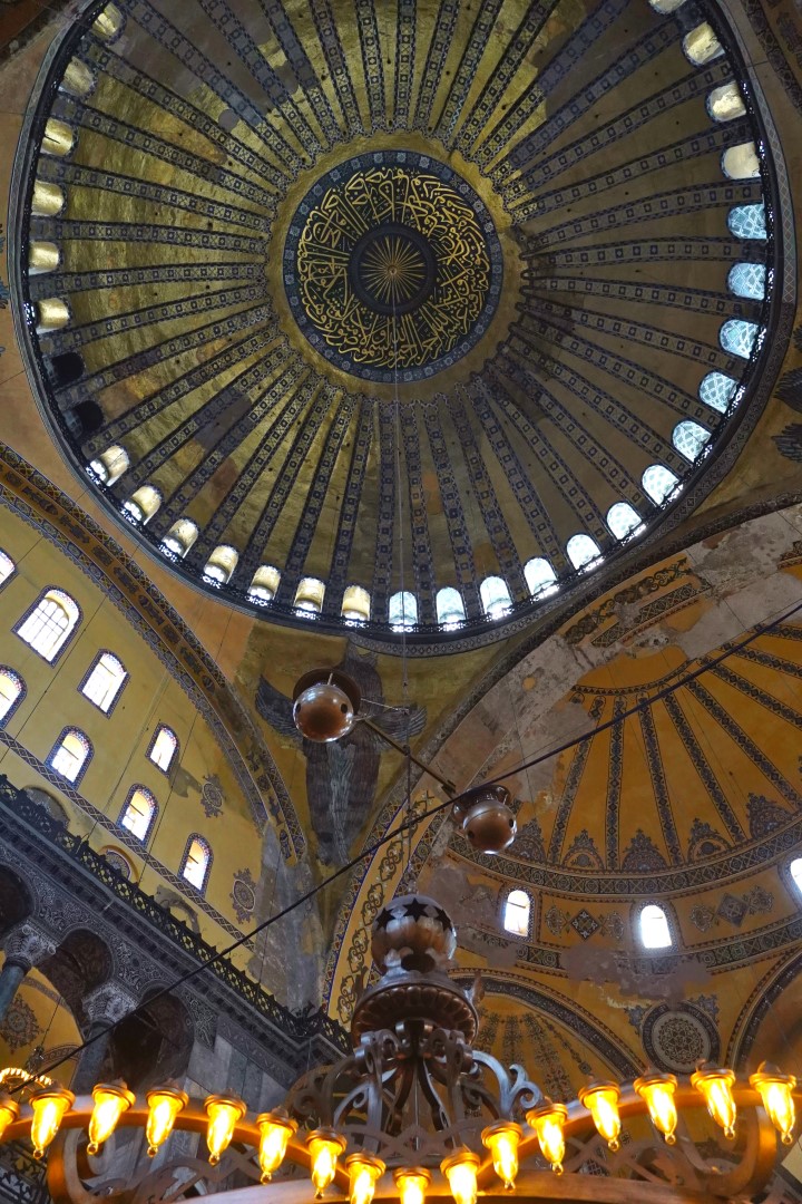 Finally, we headed across to the big enchilada. The central dome of the Hağia Sophia was constructed as a church around 537, and at the time it was of unprecedented proportions; it had a profound influence on the history of architecture. In 1453, when Muslims took control of the city, the church was converted into a mosque. Not long afterward, the distinctive spires were added, lending this majestic edifice the finishing touch it needed all along. It served as a mosque until 1935, when it was converted into a museum, which existed until 2000; and in 2018 it resumed its function as a mosque — and an extremely popular tourist destination.
