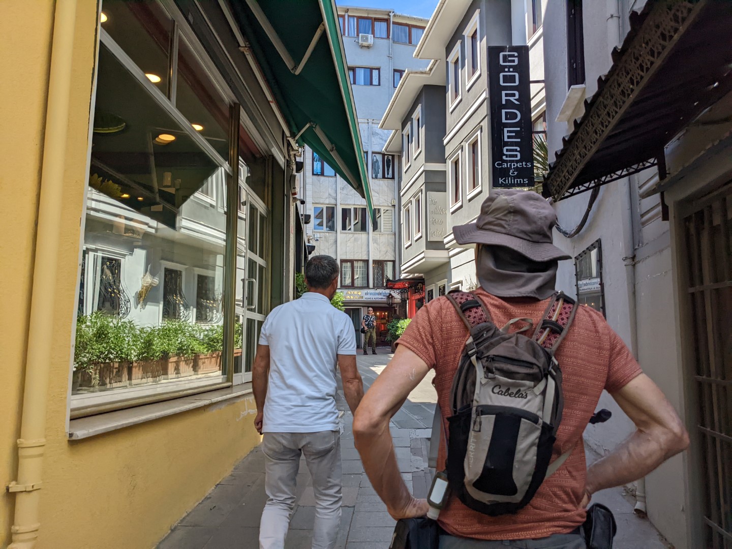 And then he said that, by the way, he had a shop nearby, and he’d like to show it to us. Well, out of sheer curiosity to learn whether he was just another con man, we accompanied him into the little shopping center next to us. First, he said, he wanted us to meet a couple of friends, so he took us into a rug shop; and as soon as we walked in the door, a couple of gentlemen went into their well-polished routine of unrolling fancy rugs with a flourish and a smile. People really think we’re in the market for rugs to stick into our backpacks.