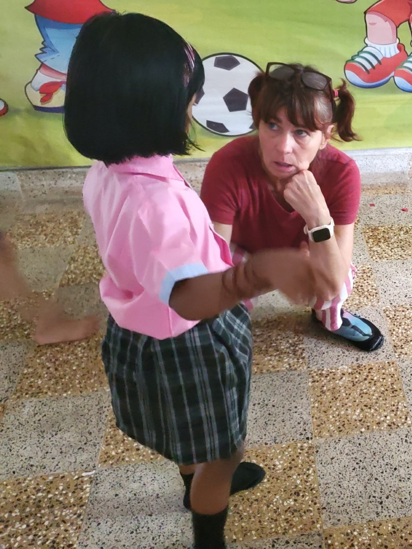 The third grade consisted of only 4 students. The one boy in the class was quite capable, but was rather shy and totally overpowered by the 3 girls, all princesses who presented quite a discipline problem. They found a good outlet for their energy when we started doing theatre with them, but they would get upset if they didn’t get the part they wanted.