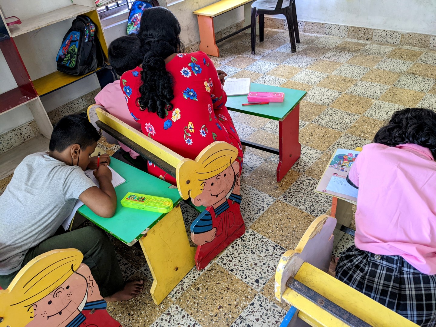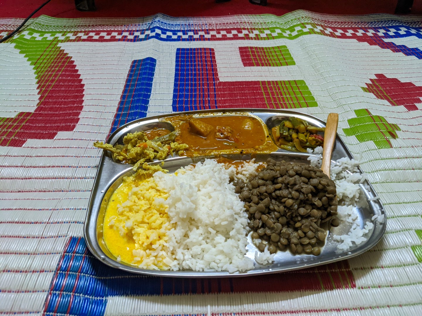 The containers that people use to carry grub on the go are rather ingeniously designed metal bowls with lids that stack together and are fastened into place by a flat bar that connects them all on the side. Students who bring their lunches to school use this system; at this particular school, lunch was supplied, but you might see the kids toting their snacks thus. The food in this region, by the way, is about 90 percent vegetarian, a real boon to us. (But high in saturated fat, with a lot of coconut oil and ghee, which is clarified butter.)