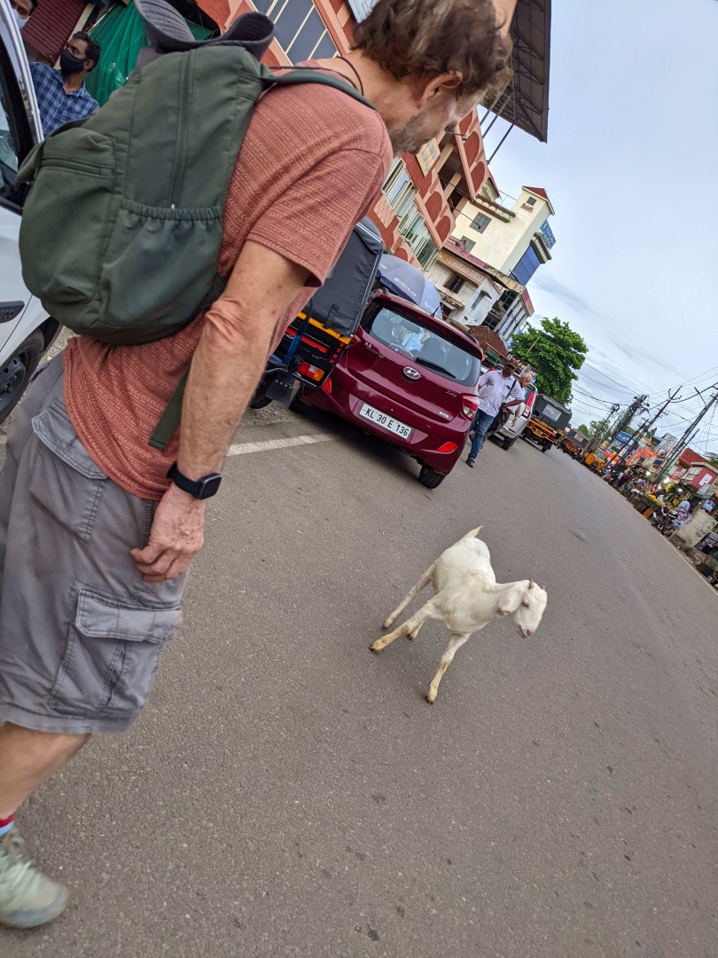 Meanwhile, India still seems sane enough (well, except for the traffic), at least from what we’ve seen. Chengannur is a charming little city where goats on the street are a common sight. (Interestingly, there were few cows, which as we’d learn later, are quite common on the streets of many Indian towns.) And people are extremely friendly — almost too friendly. They constantly stop you on the street to snap selfies with you. Okay, that’s not so bad. But when you go shopping, the sales clerks — sometimes more than one — will follow you around and stay at your elbow every step of the way, trying to be of help. On a couple of occasions, we had them picking products off the shelf that they recommended (based on what we’d been looking at) and put them in our cart. One fellow even tried to take the shopping list from our hand and find the items for us.