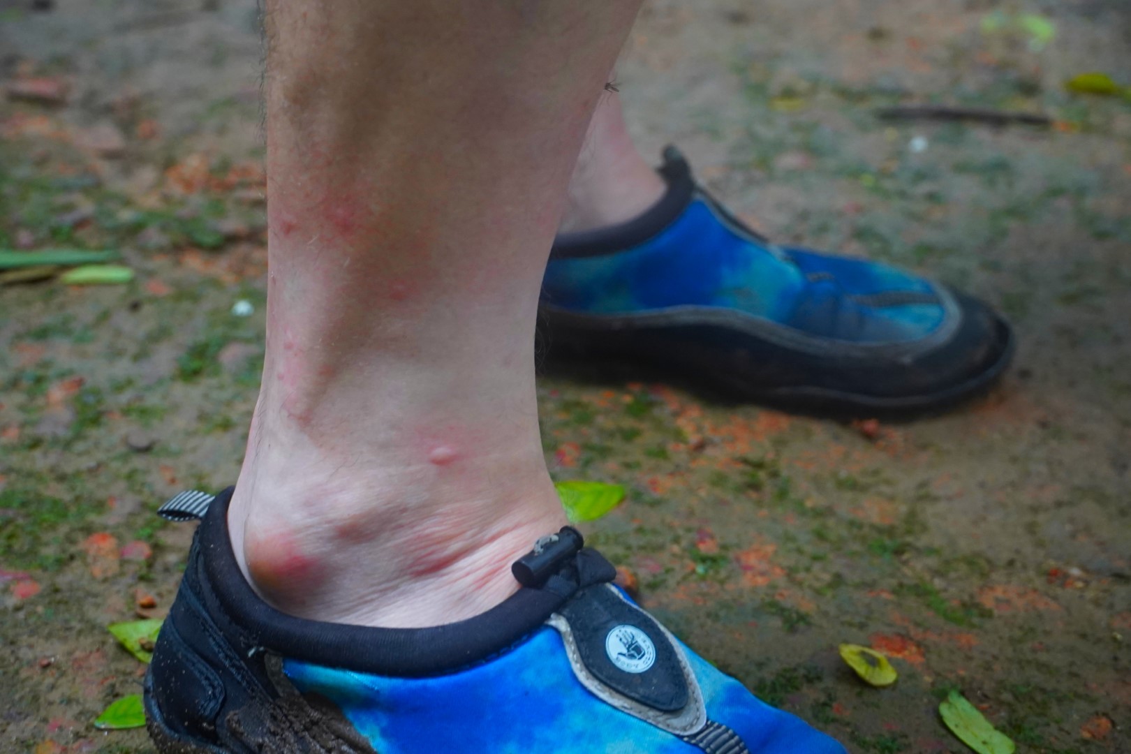When we arrived at the sanctuary, it appeared that the birds also had had trouble finding their way. Very few of them were in evidence anywhere. There were, however, enough mosquitoes to take up the slack — we began to suspect that maybe they had eaten all the birds. Even though there’d been quite a bit of rain lately, and we were hiking through a swampy, forested area, we somehow had neglected to prepare for the possibility of the little vampire bugs being present. And they made us pay for our mistake.