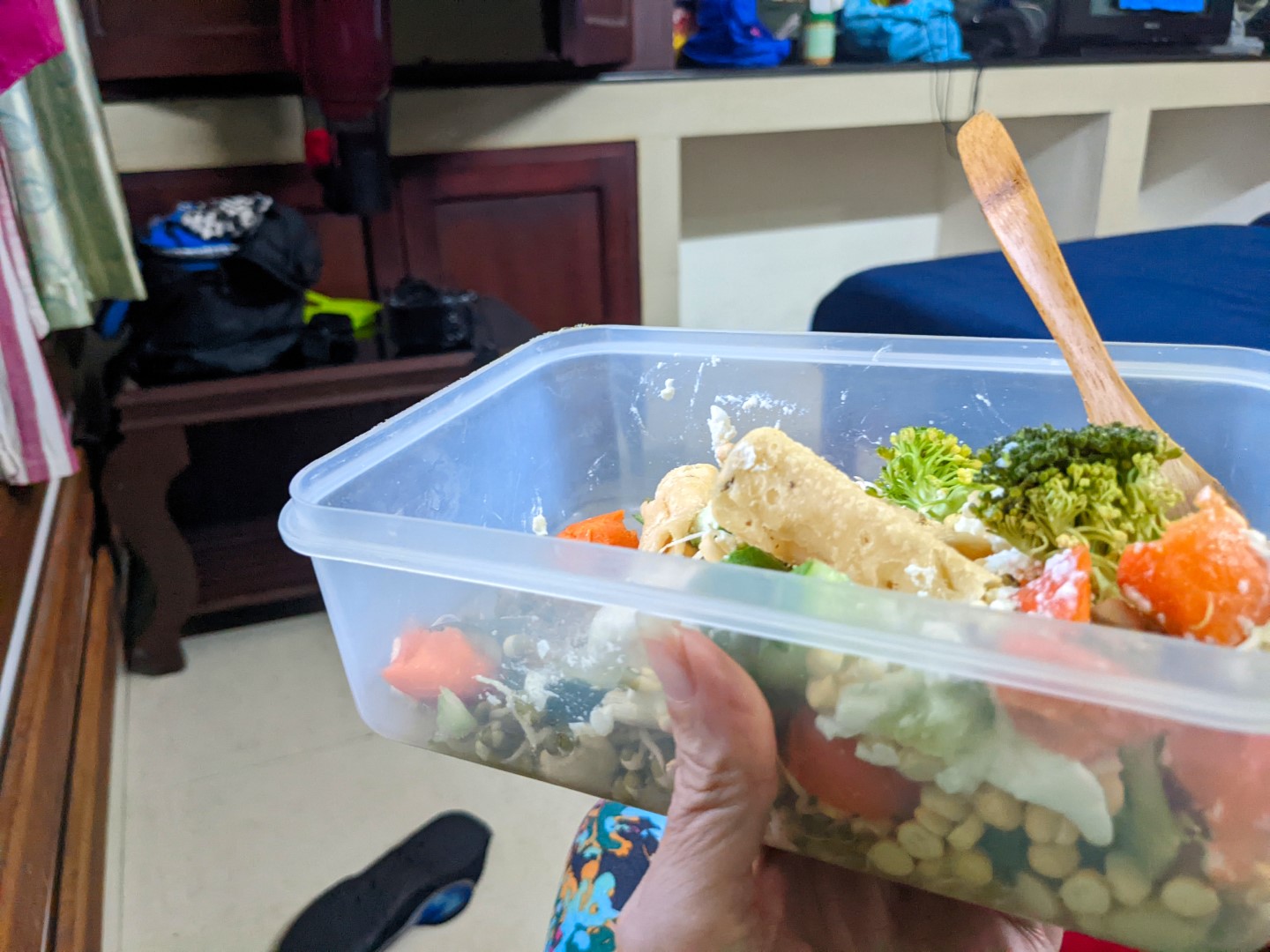 We could get by with just a way to heat water, since this would enable us to brew that all-important cup of tea in the morning; and it would also enable us to prepare oatmeal. But alas, we also didn’t have any such thing at this hotel. So we took the matter up with the desk staff, who were quite helpful, and offered to bring tea to us each morning Well, that took care of one problem, but still left us trying to assemble meals that didn’t require any heat. Which, heaven knows, we’d done plenty of times before.