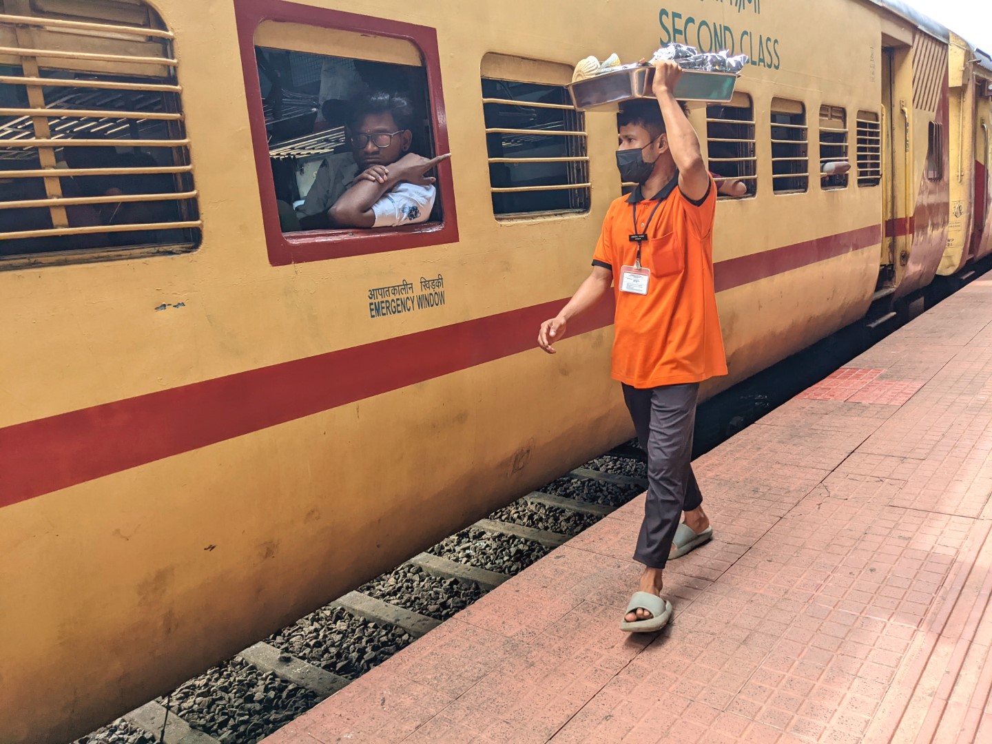 A train trip in India is always an immersion into a vibrant mélange of humanity, a scintillating swirl of flesh and color. When we arrived on the platform and sat down to wait with our bags (there were waiting rooms, segregated by gender, but they were pretty much at capacity), we were approached by a man dressed in an orange tunic (or whatever the appropriate name is), who just stood there and stared at us expectantly. Was he a panhandler? A recruiter from a cult? Somehow we overlooked that he had a little cart next to him; and it was not until we saw another man passed by pulling a cart and wearing similar attire that we realized they were porters. At this point we indicated to him that, no thank you, we didn’t need his services.