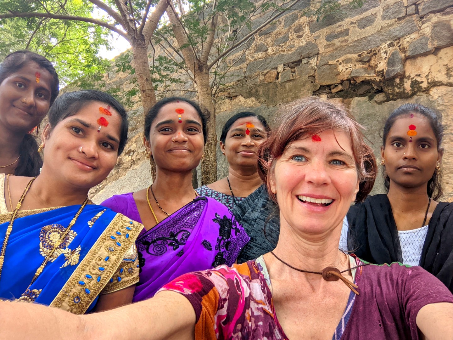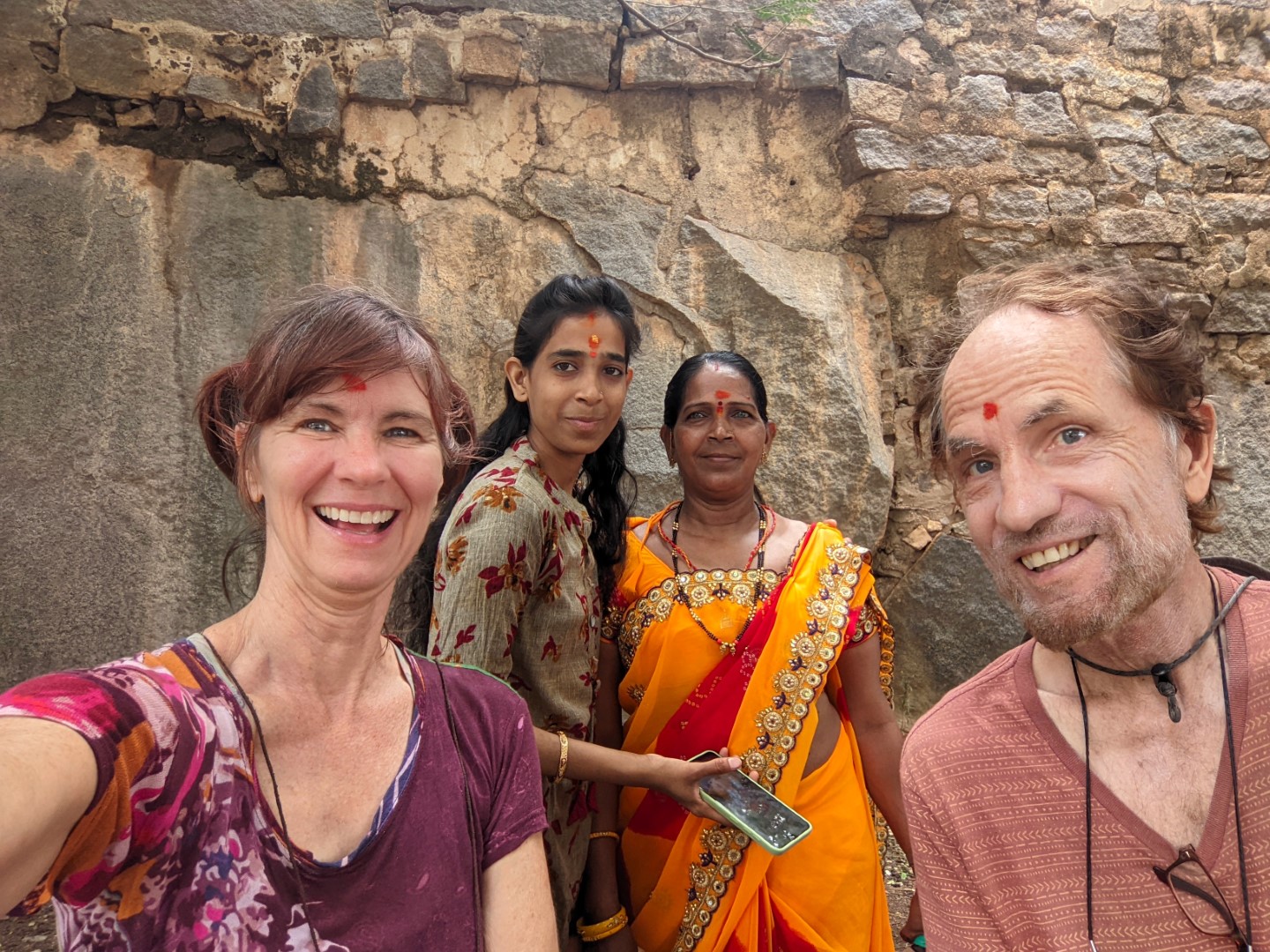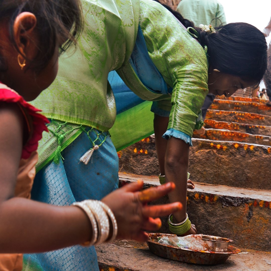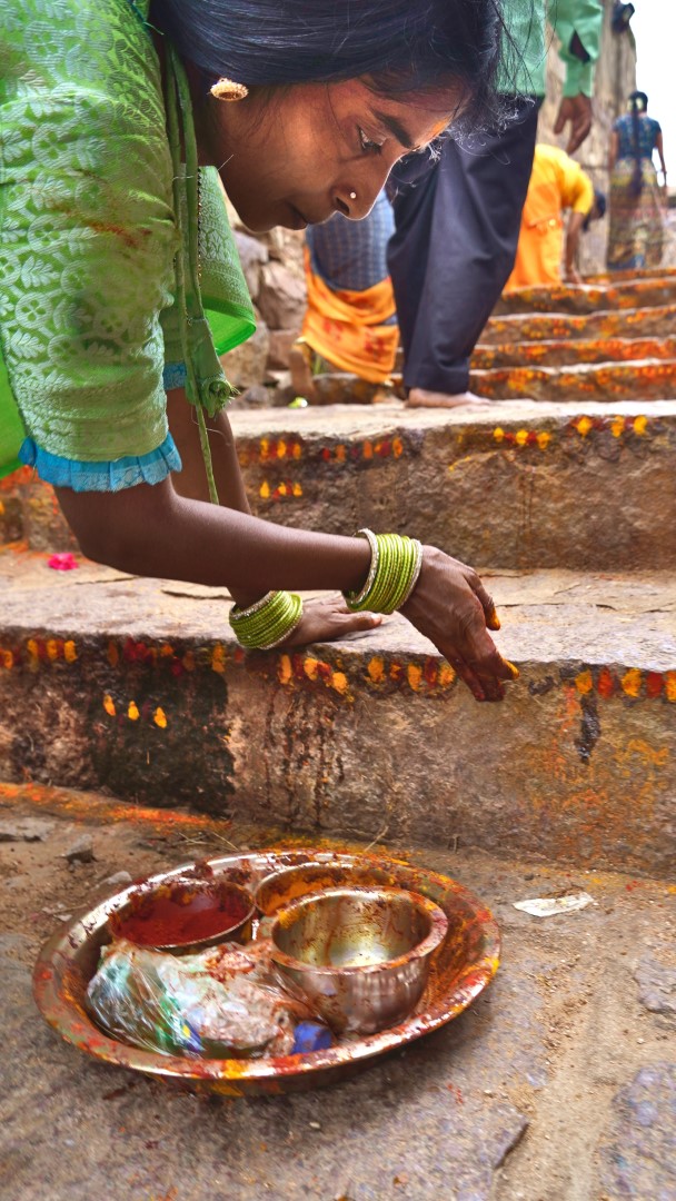The steps we stepped on were busily getting a makeover from several women and girls applying what appeared to be multi-colored paint, (orange, red and yellow) but no doubt it was more like chalk, some kind of pigmentation that could be removed readily by rain or a grumbling caretaker. What was the purpose of this kaleidoscopic colorization? We never did learn, but we assume it was a ritual to insure good fortune, symbolizing a brightening of the pathway toward one’s destination. Or something.