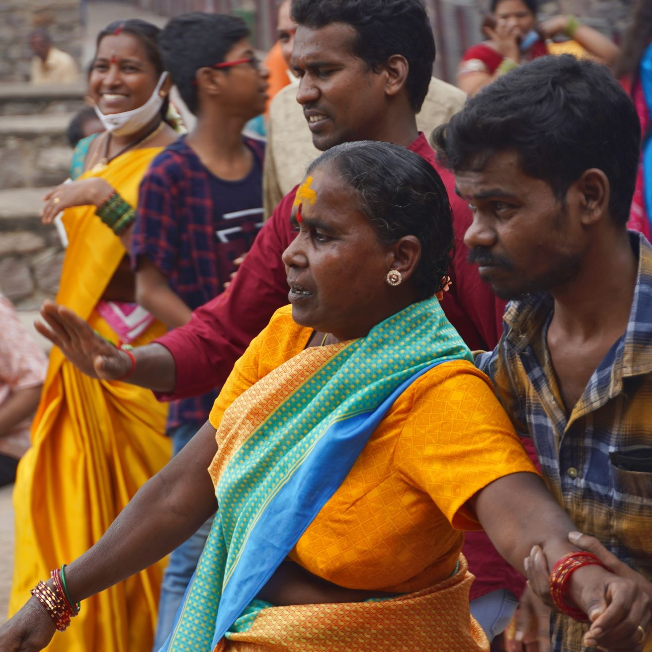 Perhaps the most fascinating thing we witnessed was a procession (for want of a better word) of what appeared to be a sect of charismatic Hindus who reminded us of a voodoo cult or some such. A couple of fellow were thumping on drums while the cluster of devotees moved in rhythm to the drumming. At the center of the group was a woman who appeared to be a sort of queen bee, and acted almost as if she were in a trance. A couple of times, she smashed coconuts by hurling them to the ground. We really found ourselves wishing for once that we had a guide to explain all of this to us.