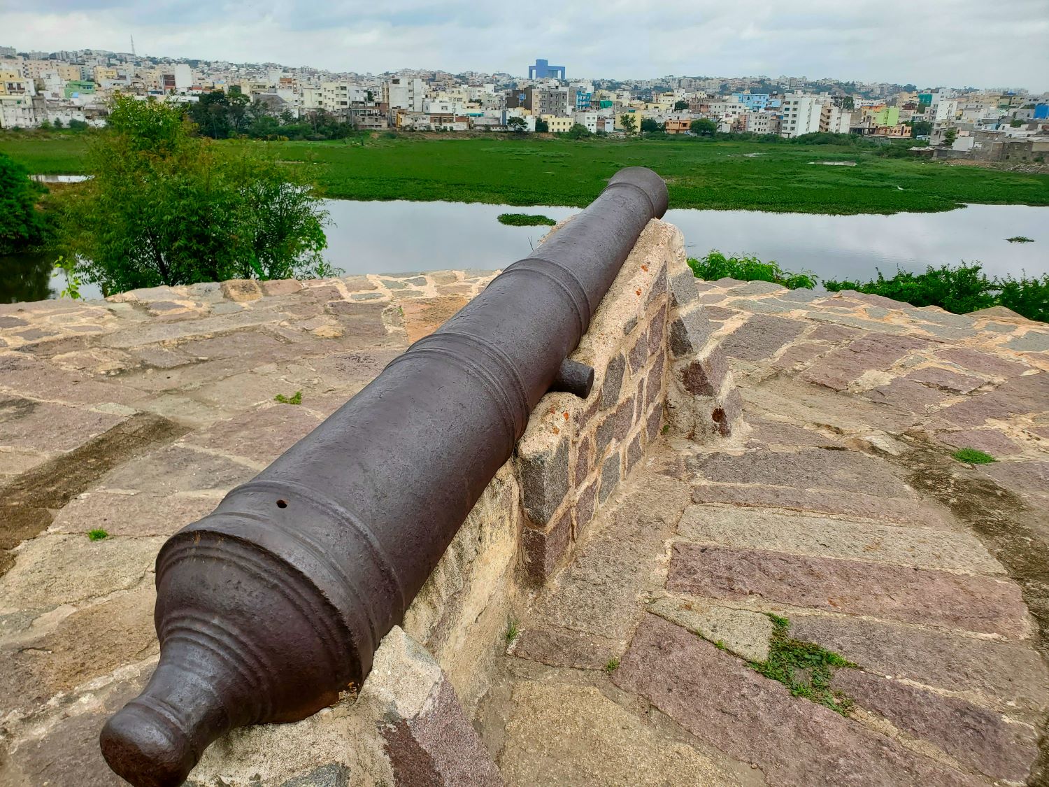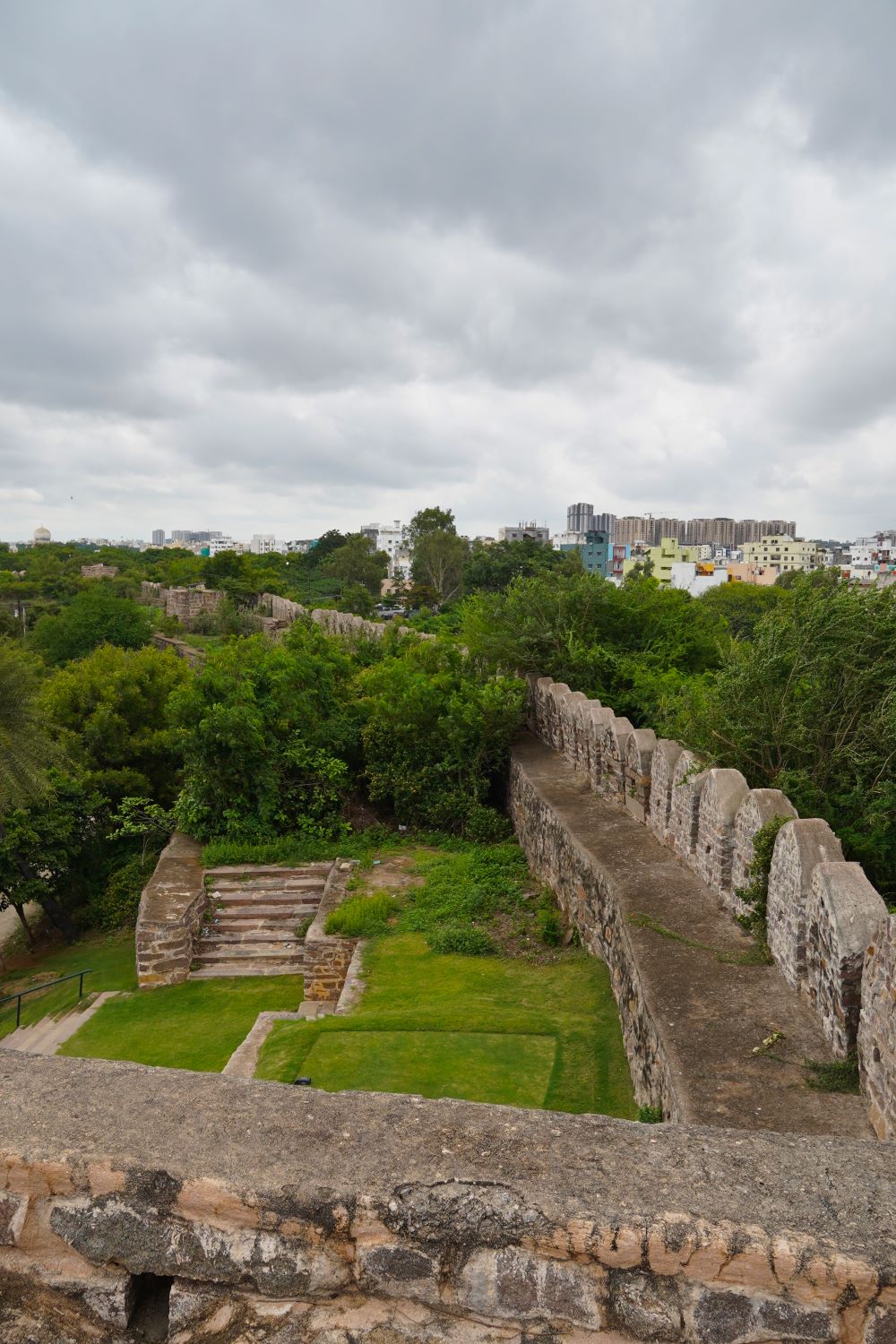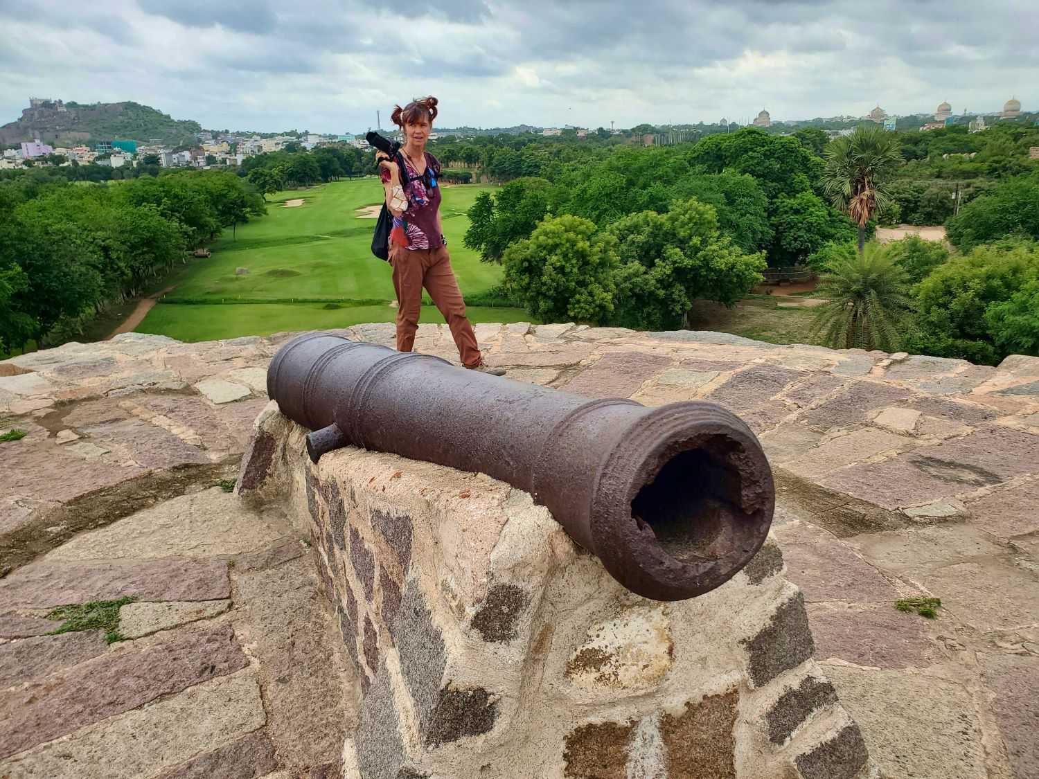 Passing by the Hyderabad Golf Club (the only public golf course in the city), we came to the walls of more ruins that seemed to extend out from the Fort. But this section of structures could be accessed by anyone without paying admission. Evidently Hyderabad has so many ruins that it can afford to keep a spare set. These walls had steps that one could mount up to the tops of the little towers where the cannons were located.