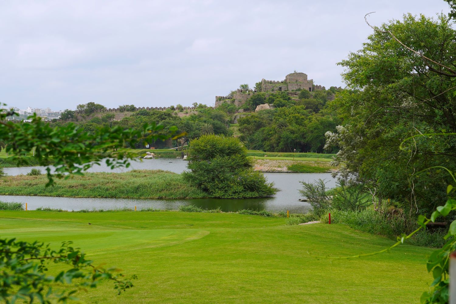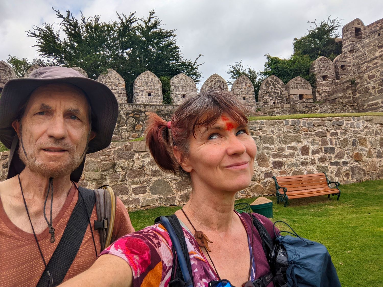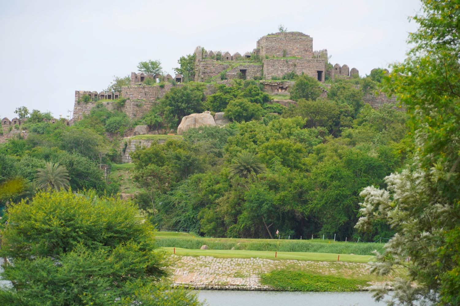 Passing by the Hyderabad Golf Club (the only public golf course in the city), we came to the walls of more ruins that seemed to extend out from the Fort. But this section of structures could be accessed by anyone without paying admission. Evidently Hyderabad has so many ruins that it can afford to keep a spare set. These walls had steps that one could mount up to the tops of the little towers where the cannons were located.