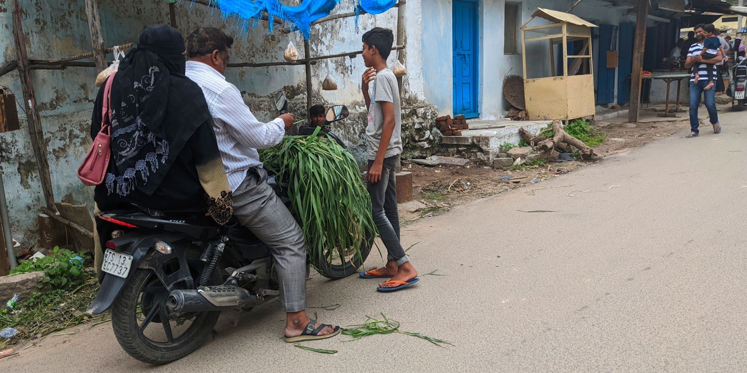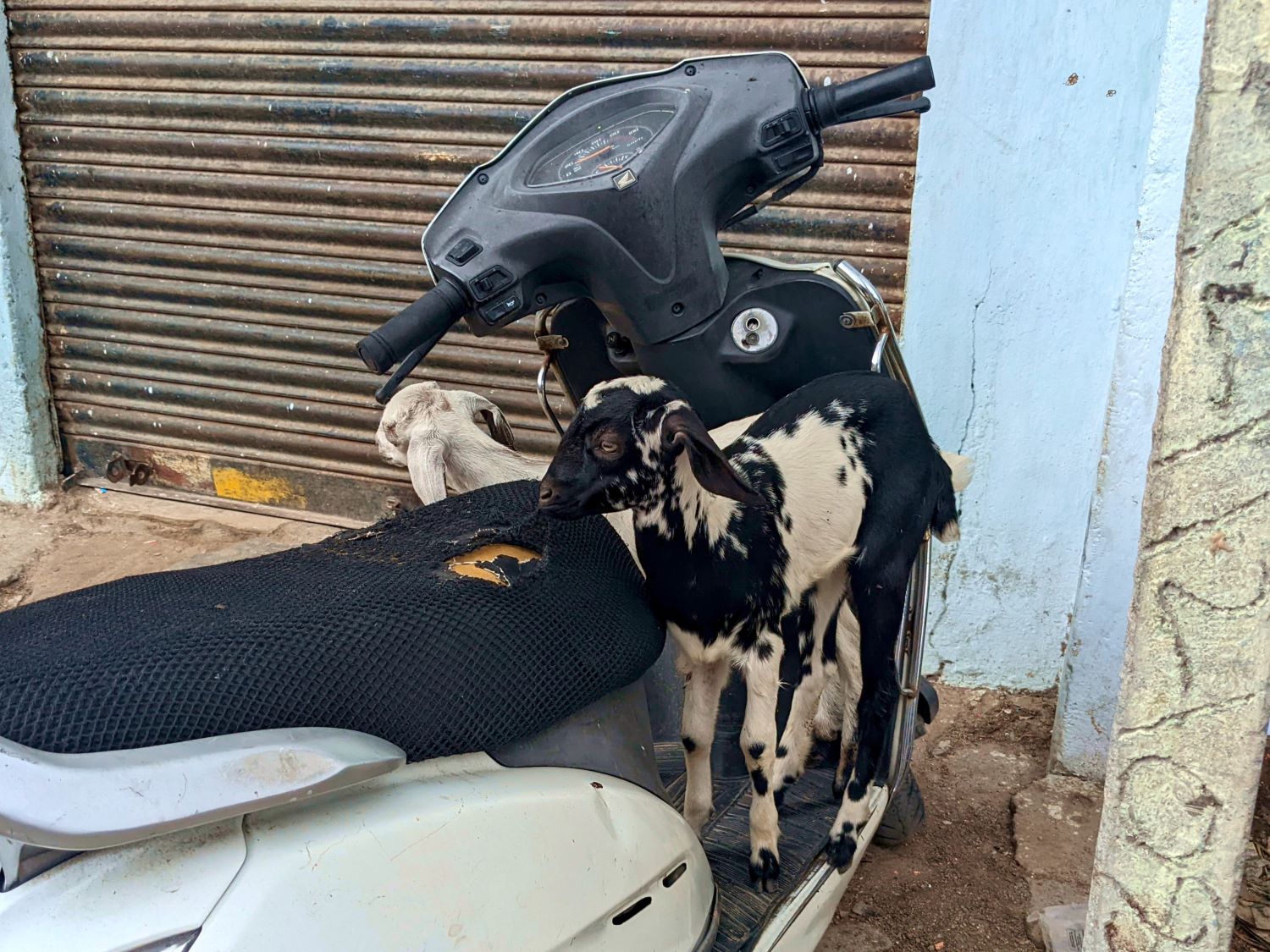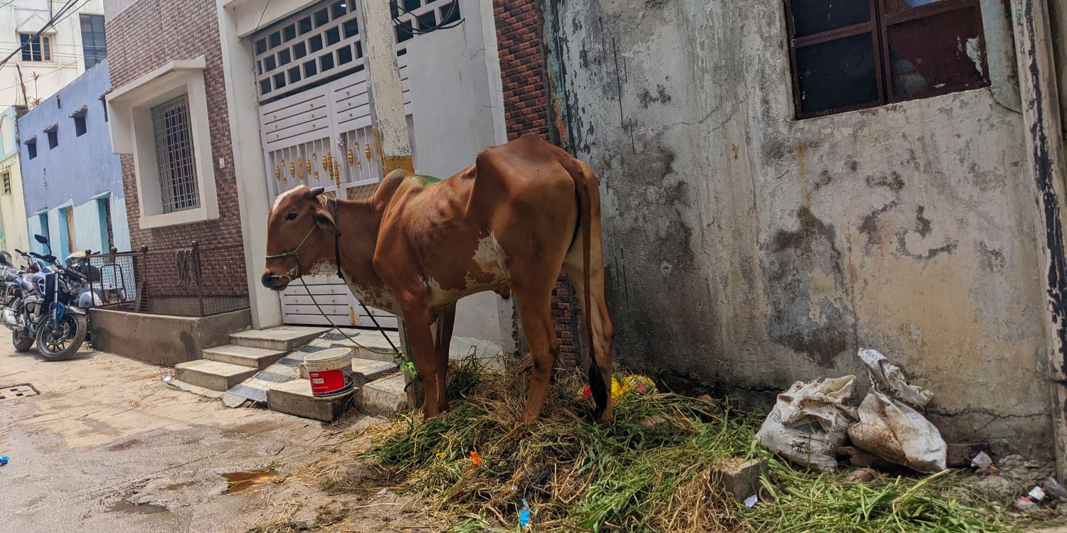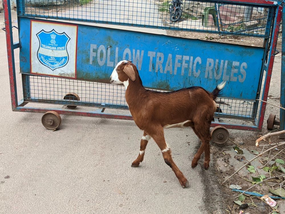 Having paid our respects to the tree, we caught a tuk-tuk the rest of the way home, zig-zagging through more of the vibrant neighborhoods of Hyderabad. At one point, we passed by a moto (motorbike) on which a couple of goats were lounging. So of course, we snapped their photo. Later, a friend who’s spent a good amount of time in the country, saw the photo and commented that this was a “very India” sight.