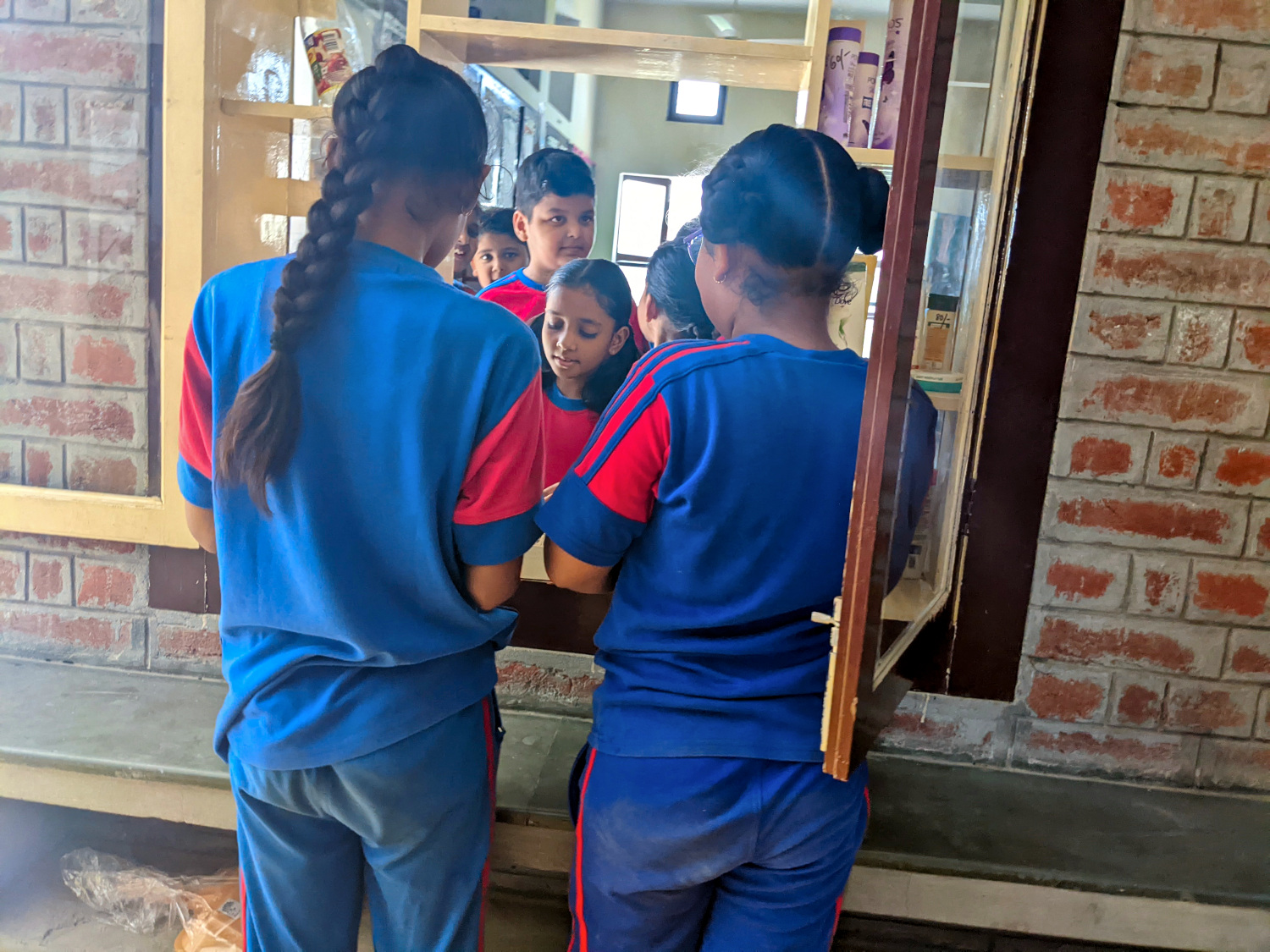 After we’d been driven back to headquarters, we were served lunch in a little cafe/ herb shop downstairs. Then we had a meeting with the four principals, school director, and other administrators. Of course we were served chai with cookies (“biscuits” in the British parlance adopted by the Indians); chai, which is sweet, spiced Indian tea with milk, is served at every occasion and opportunity in India. In our experience, it’s almost always delicious.