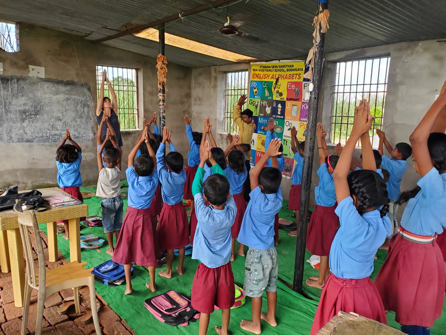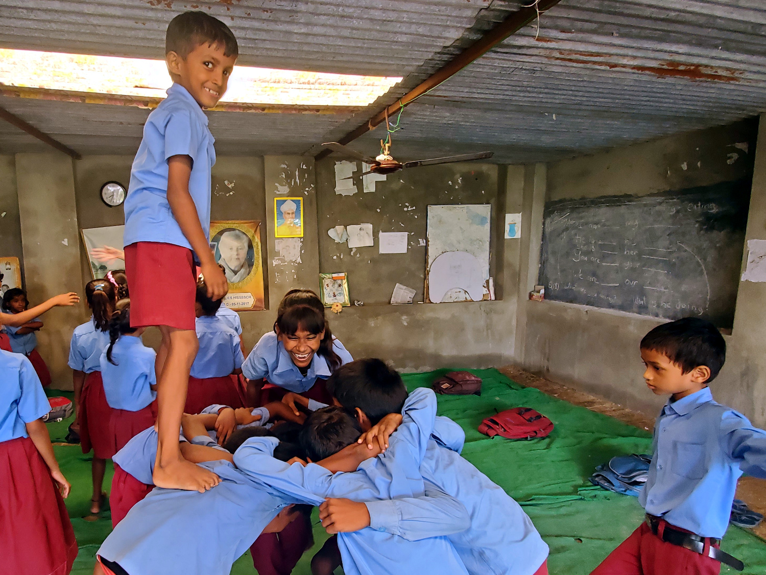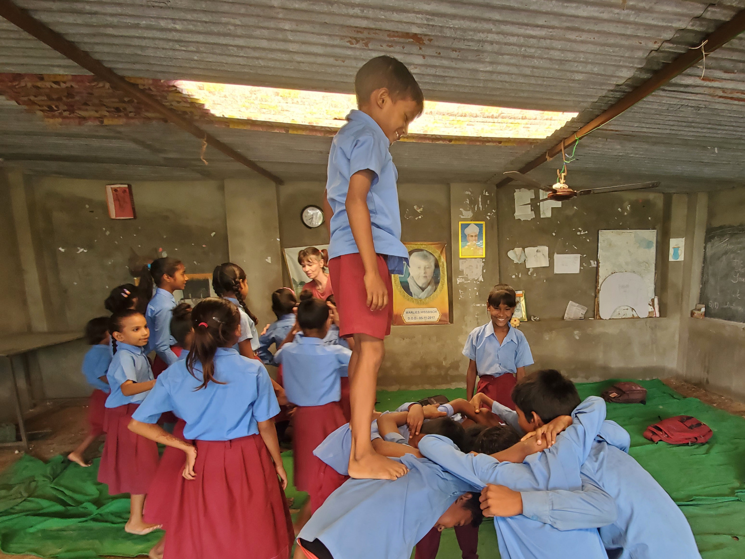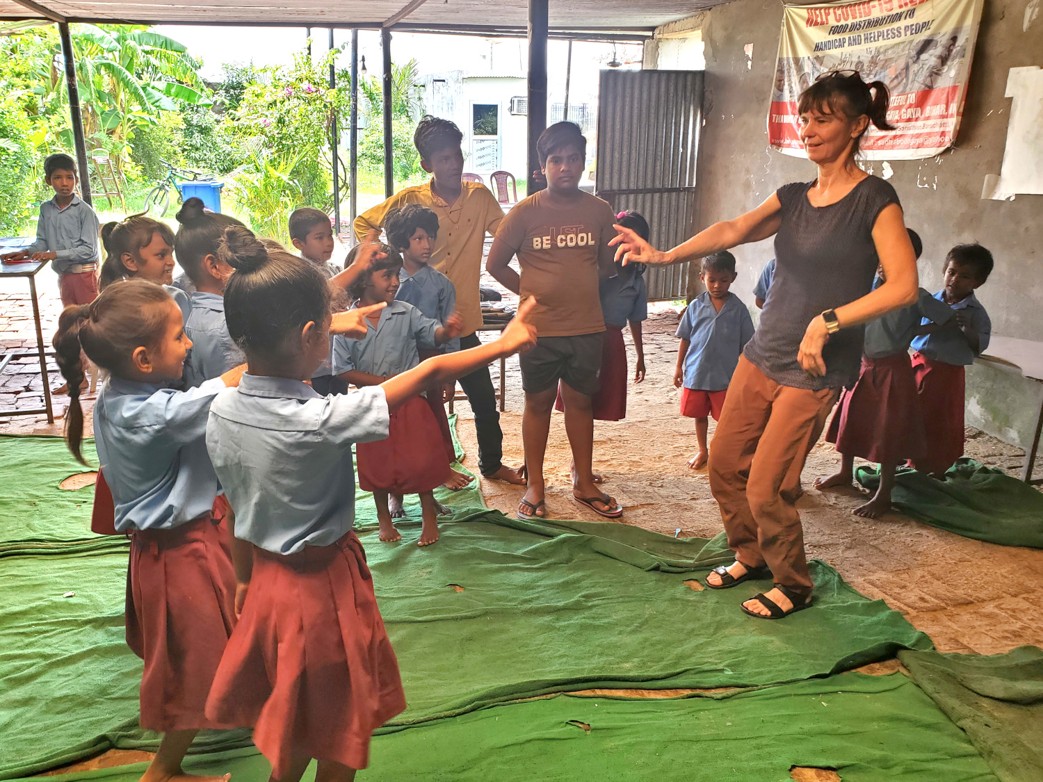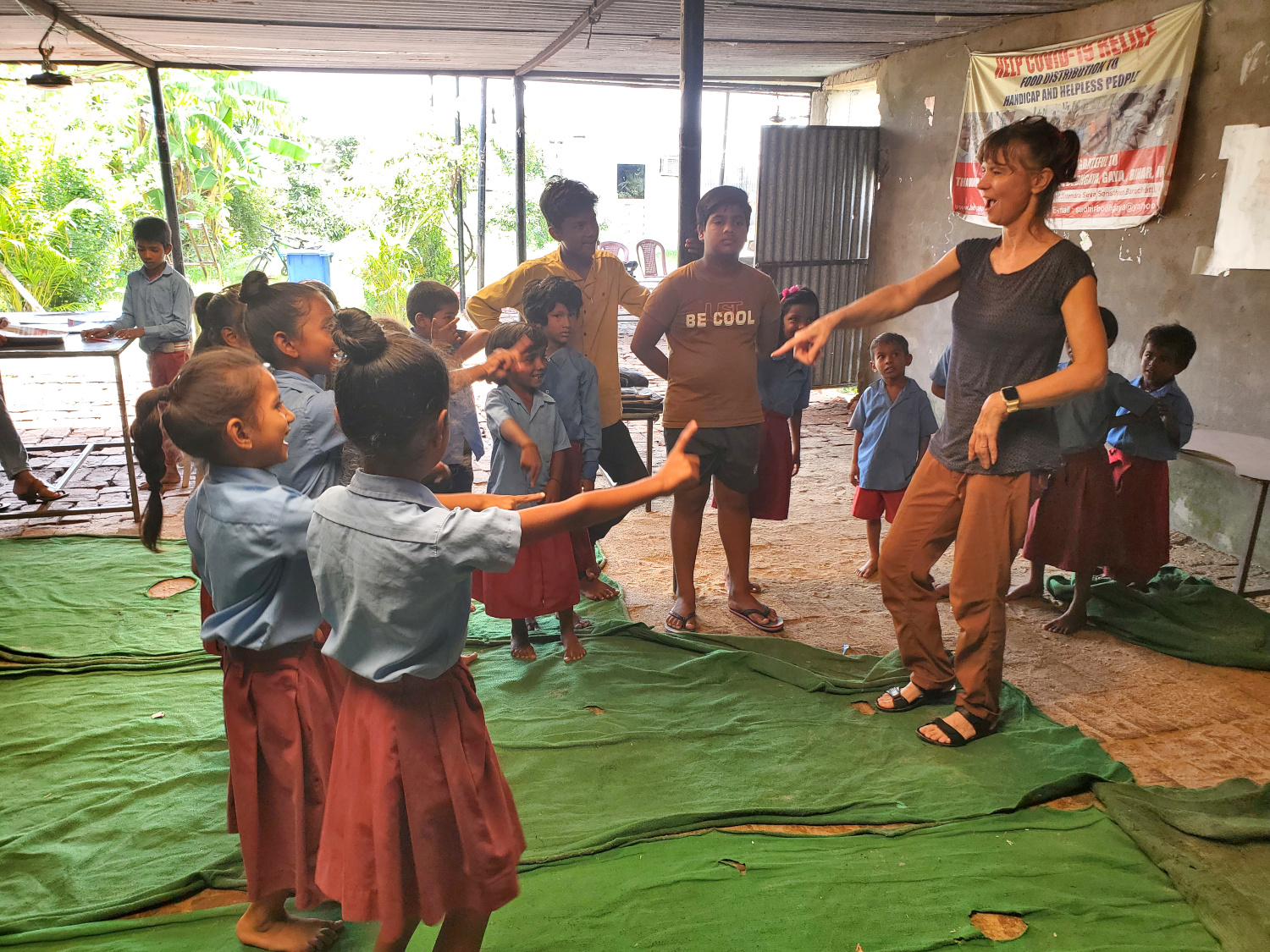 On the first day, we did little more than observe. But on the second day, we started teaching sessions with both groups, leading them in English exercises, theatre games, tai chi (Dennis) and yoga (Kimberly) — the irony was not lost on us of Americans teaching yoga to students in India.