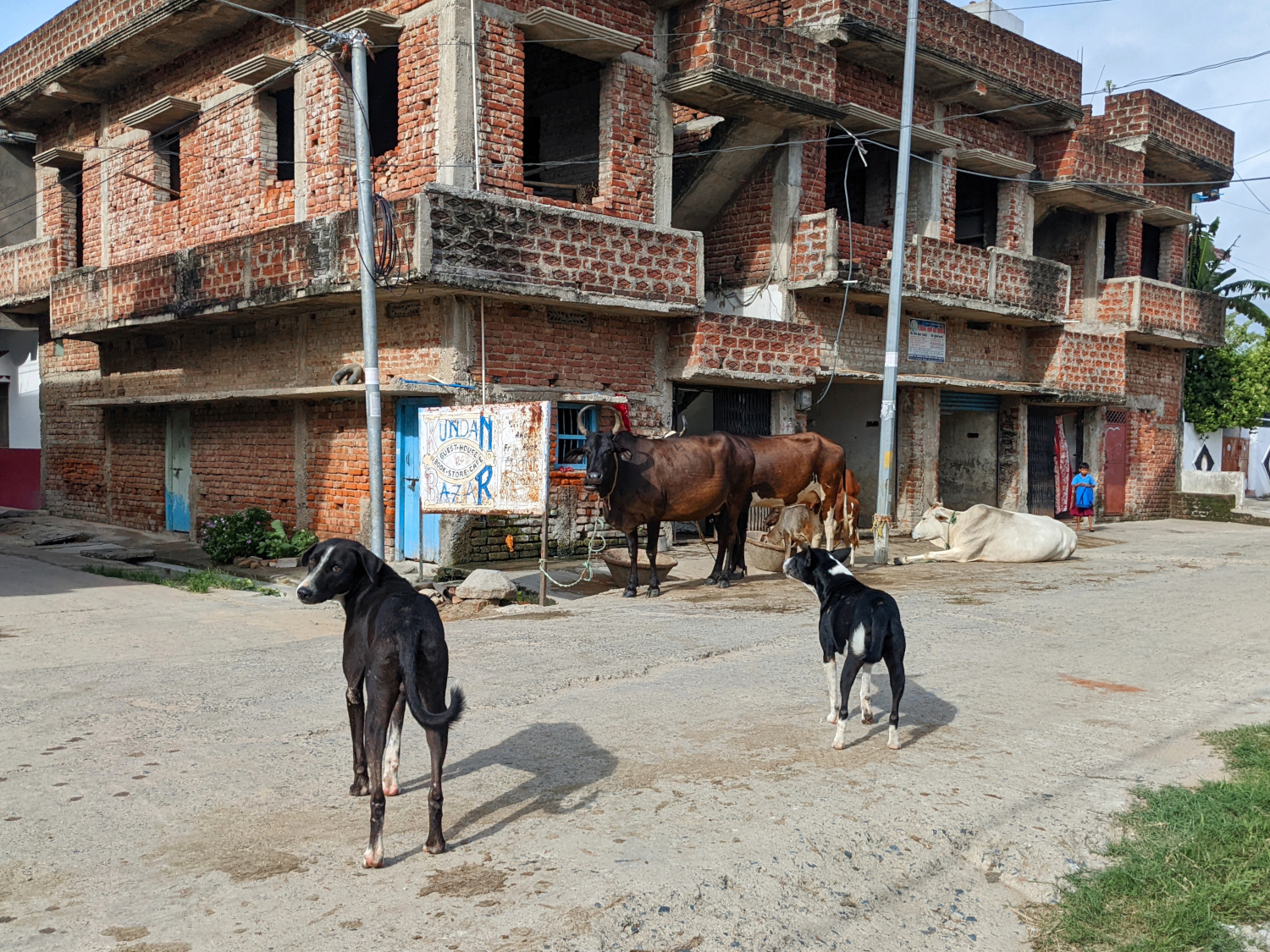 Bodh Gaya is a study in stark contrasts. On the busy main streets — of which there are only three or four — there is an ample presence of foreign visitors and the businesses that cater to them. But turn a corner and suddenly you’re in the much larger section of town where the locals live. And it’s a sector of dire poverty and squalor. The streets are muddy and full of livestock and their refuse. The buildings where people live are old and in many cases don’t have glass over the windows. Apparently they don’t have running water either, because you’ll often see people bring jugs to fill at a pump on the corner. Sometimes they’ll also take a bath out there. There are beggars from these parts of town, including children, but they mostly hang out in the tourist areas, where the money is.