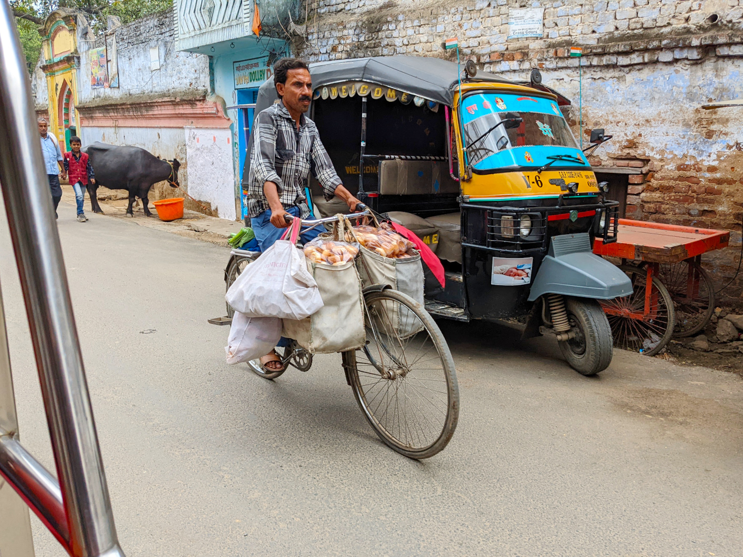 So we had the driver drop us at another supermarket, which wasn’t nearly as big and all-inclusive, but it was the best alternative we could come up with. Actually, he didn’t exactly drop us; he came inside and waited with us, and even “helped” us shop. He lived in Bodh Gaya, so he was hoping to be the one to give us a ride back there, picking up two fares instead of wasting half a drive. And he seemed prepared to wait around all day for our business, or at least for a couple of hours. So we didn’t make him wait that long, but curtailed our outing and headed back home as soon as we’d shopped at the store, where we found some, but not all, of the items we were seeking.