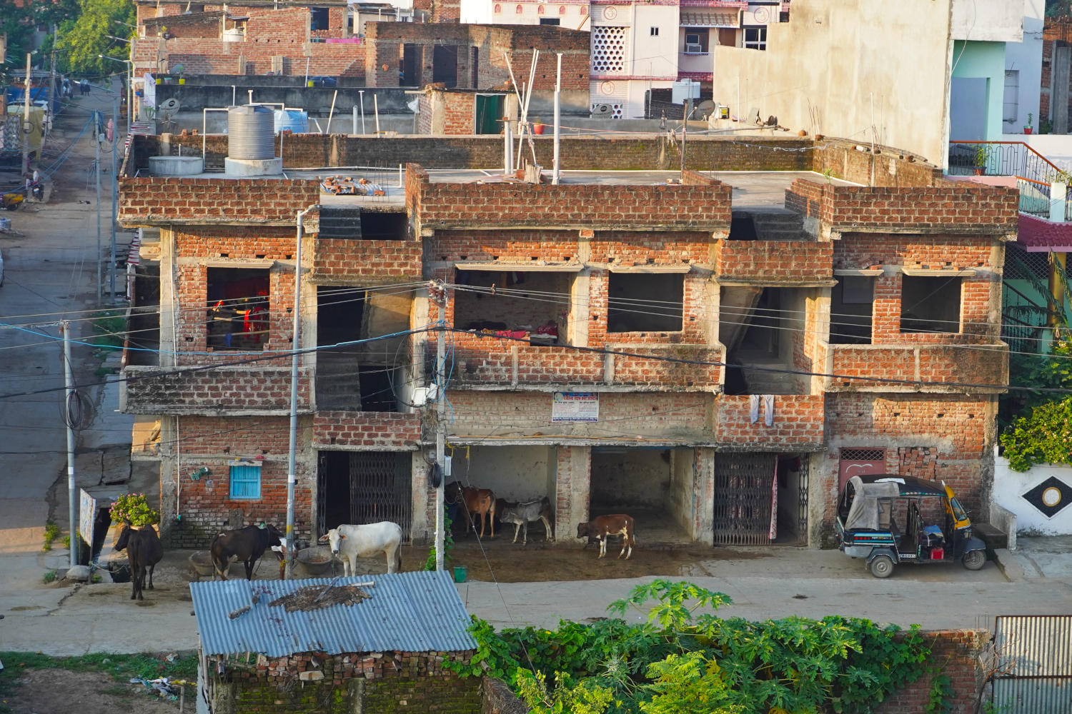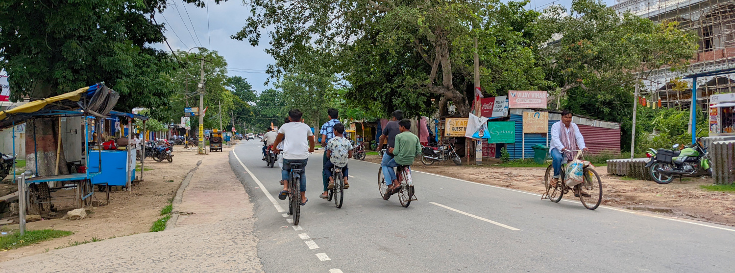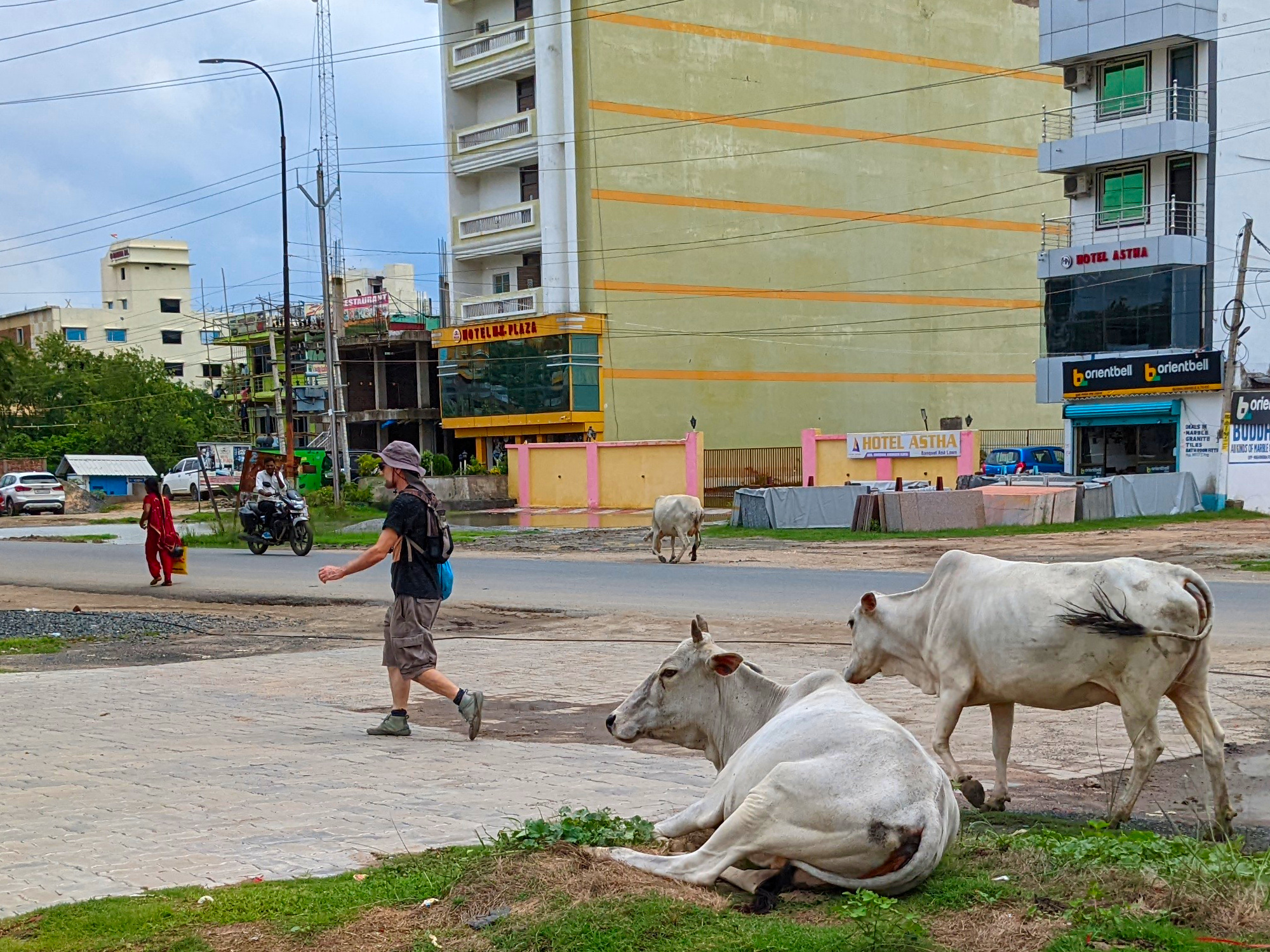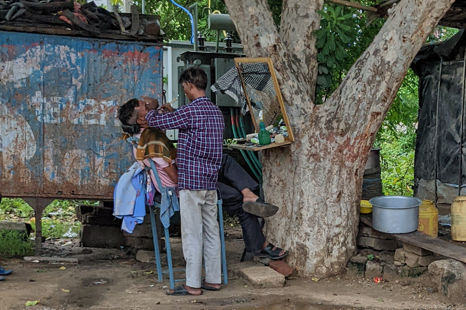 In the afternoons, we continued our explorations of the fascinating town of Bodh Gaya, which seems to alter a little day by day. The monsoons had brought some reprieve from the swelter, but they left mud puddles to negotiate. And the mud was sometimes blended with the output of the cows that ruled the streets all over town. It amazed us to see how so many businesses, including barbers, operated beside the road in the open air.