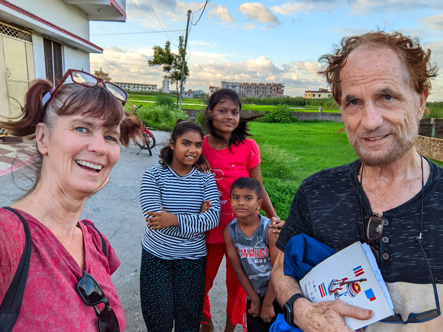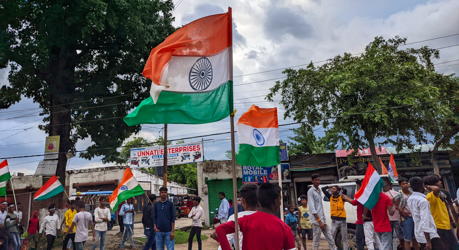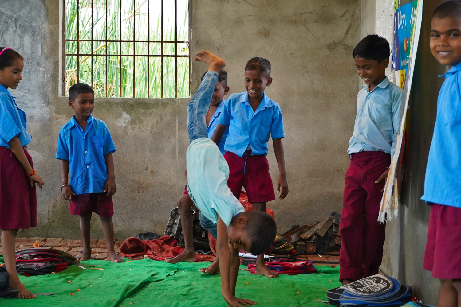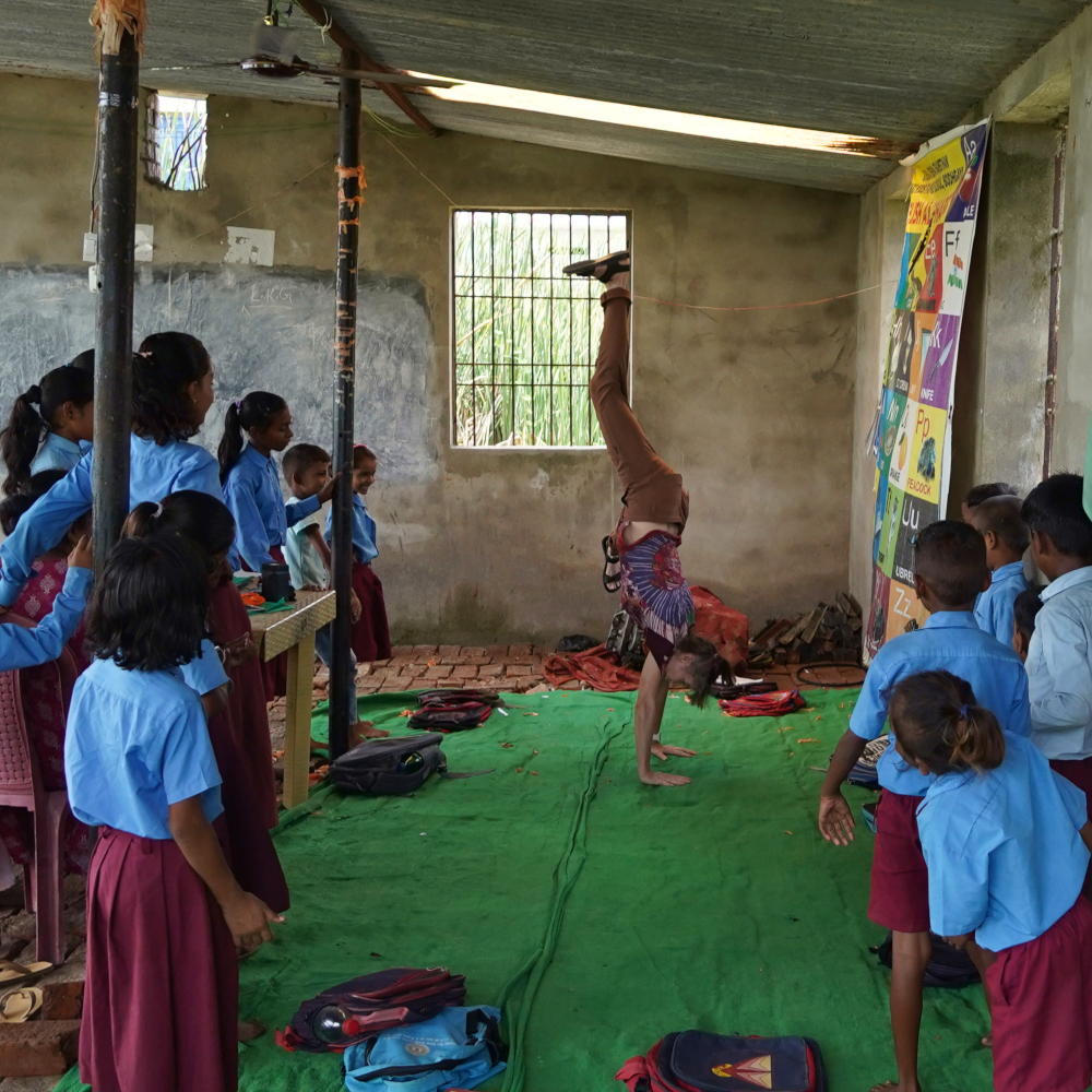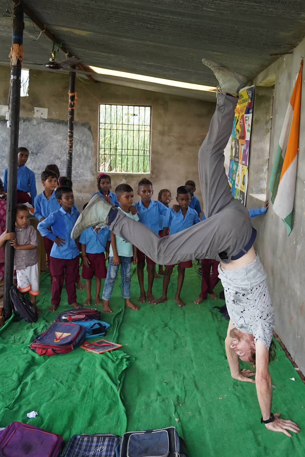 August 13 and 14 were busy days at our school in Bodh Gaya, even though there were few classes. The students and teachers, and a couple of assistants, were excitedly decking out the school for India’s Independence Day. The preparations included decorating and erecting a long, thick bamboo pole to serve as the flagpole. (Construction workers in India, where frugality is the norm, often use this kind of bamboo to construct scaffolding.) The students nonetheless took the time to join us in indulging in some handstands, cartwheels and other physical shenanigans. Good thing it wasn’t a competition — they might have beaten us hands down, as it were.