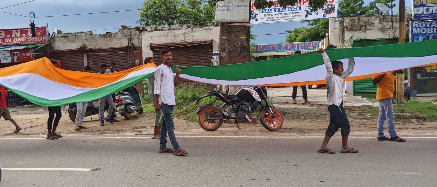 August 13 and 14 were busy days at our school in Bodh Gaya, even though there were few classes. The students and teachers, and a couple of assistants, were excitedly decking out the school for India’s Independence Day. The preparations included decorating and erecting a long, thick bamboo pole to serve as the flagpole. (Construction workers in India, where frugality is the norm, often use this kind of bamboo to construct scaffolding.) The students nonetheless took the time to join us in indulging in some handstands, cartwheels and other physical shenanigans. Good thing it wasn’t a competition — they might have beaten us hands down, as it were.