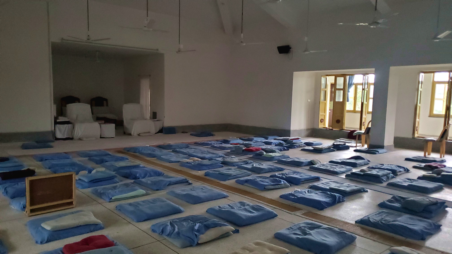 The daily routine began when we were awakened at 4:15 (yes, that’s A.M.), courtesy of a staff member ringing a bell outside our window. Then 15 minutes later we’d assemble in the assembly hall for a meditation session until 6:00, at which time we’d adjourn for breakfast. After a little break, we’d have a morning meditation session until lunch, at which time we’d be off for about 2 hours, so we had enough time to catch a nap. Then it was back for more meditation until dinner; and after another little break, there was — you guessed it — more meditation, followed by a video “discourse”. And finally we were dismissed about 9:00 to go get some shuteye.