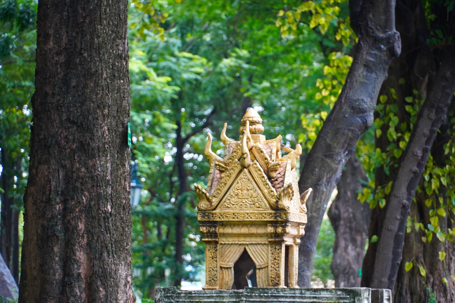 Ascending the hill and exploring the temple structures, we of course saw many impressive architectural and decorative details. But there were also many places where visitors could leave money. Many, many places. And at one particular shrine dedicated to Lady Penh, where there were several female statues on display, visitors also left offerings — not of money, but of cosmetics.