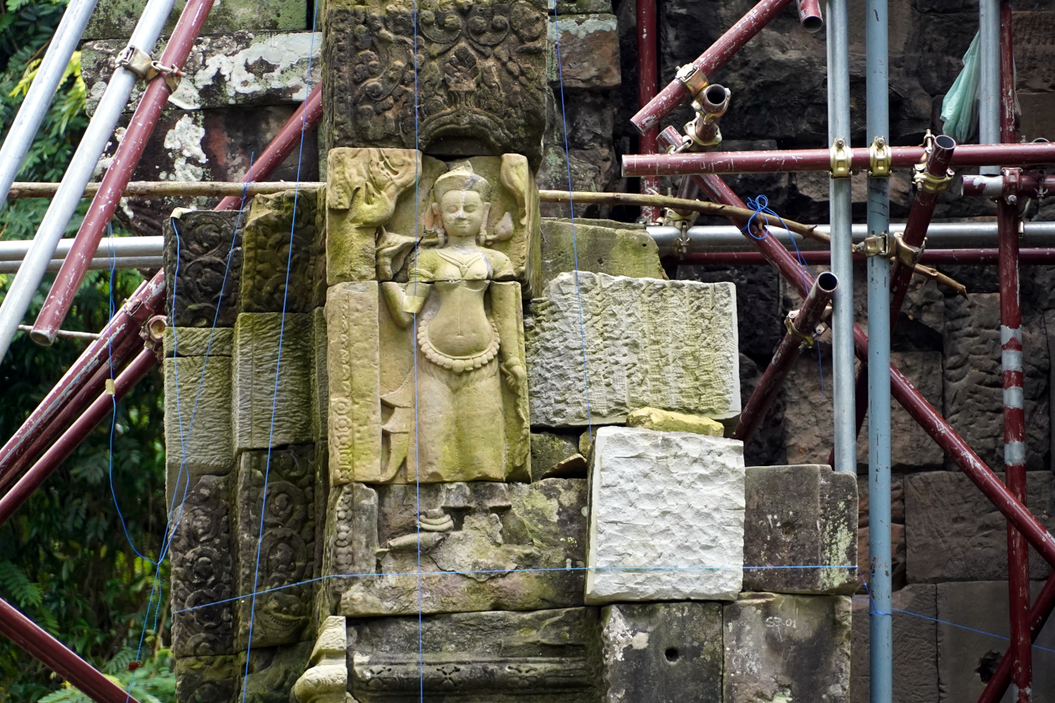 Anyway, the famous central temple certainly lived up to its billing, and then some. No matter how many photos you see, they don’t do it justice. Nothing compares to actually walking through the rocky ruins and getting a closeup look at the infinitely detailed etchings on the walls, spinning out all kinds of stories that you can’t possibly hope to decipher completely. You literally could spend weeks examining this one temple, and probably would still miss something, especially since there are several levels, that you access with some rather precarious looking stairways — ancient but still serviceable and presumably safe enough. (In many, though not all places, modern wooden stairways have been superimposed over the original stone steps, some of which are badly crumbled.)