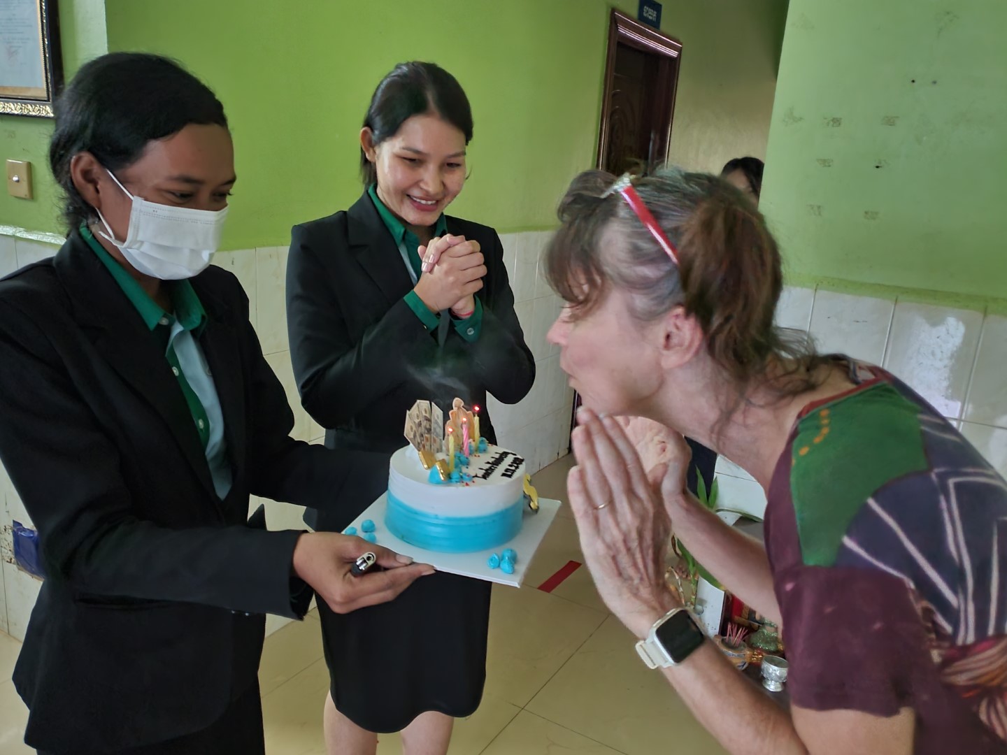 Monday was Kimberly’s birthday, and somehow the teachers learned about it. So they were waiting in the lobby to sing her Happy Birthday in the morning. They also brought out a cake. After the cake had been set down, some of the icing smeared on the table. Not to worry, the household cat came along later and licked it up.