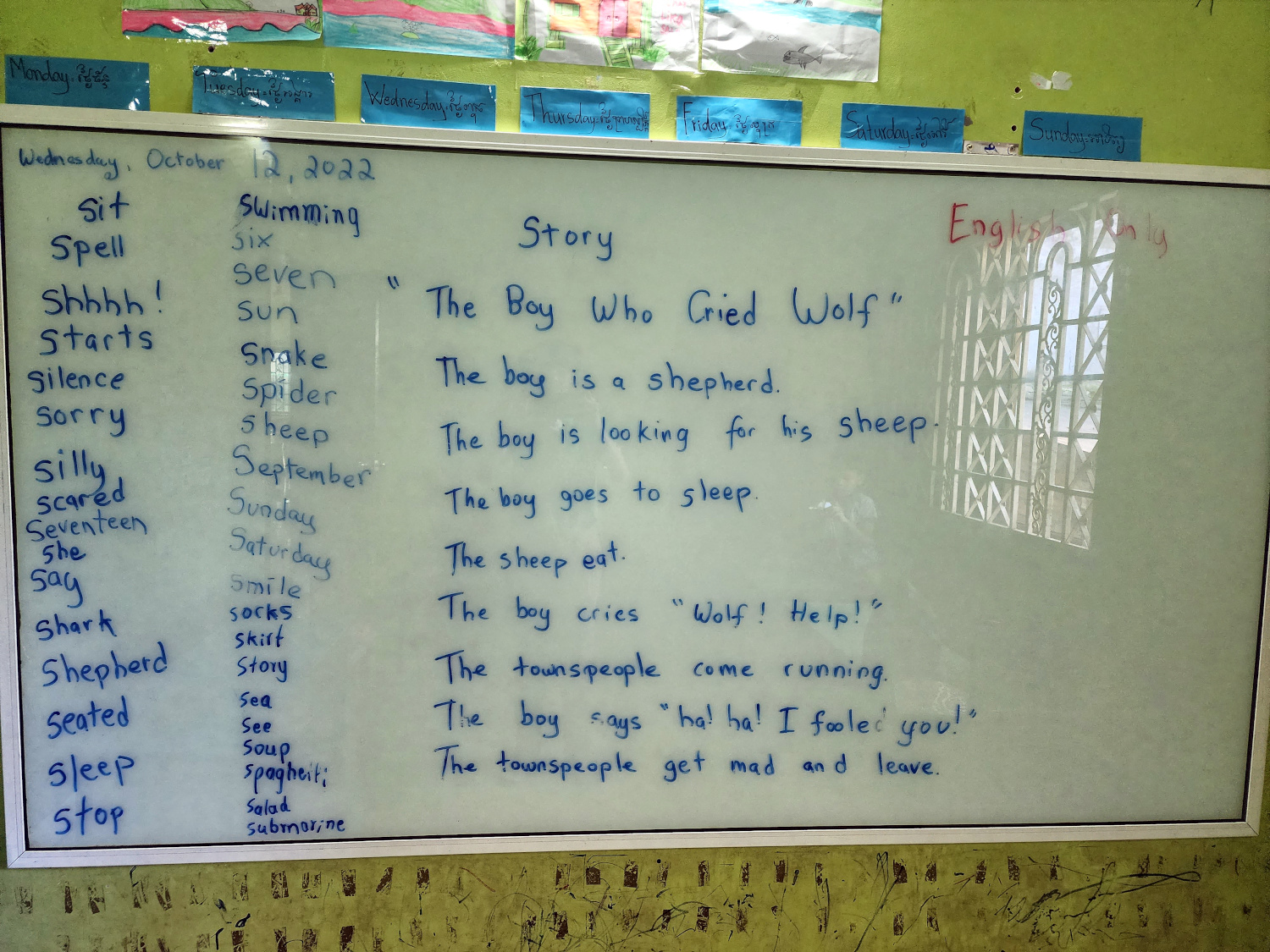 It was a school with limited resources, where the students sat on uncomfortable (to us) wooden benches at ungainly (to us) wooden tables. But at least there was a functioning marker board on which we could indulge in some imaginative projects with the students, most of whom had very limited English — so the visual element was crucial. Unlike what (we suppose) would happen in most American schools, we didn’t throw away markers when they were empty, but refilled them from bottles of ink.