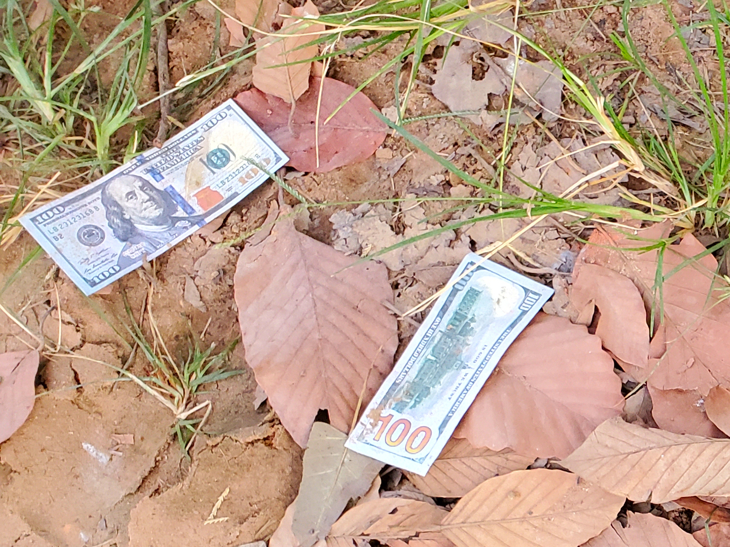 One bit of color we stumbled upon that we had not anticipated was 100 dollar bills. Strewn all over the ground in one spot. Really. Well, sort of. We picked one up and examined it, and it looked entirely authentic except for the word “COPY” in small letters down near the lower left corner.