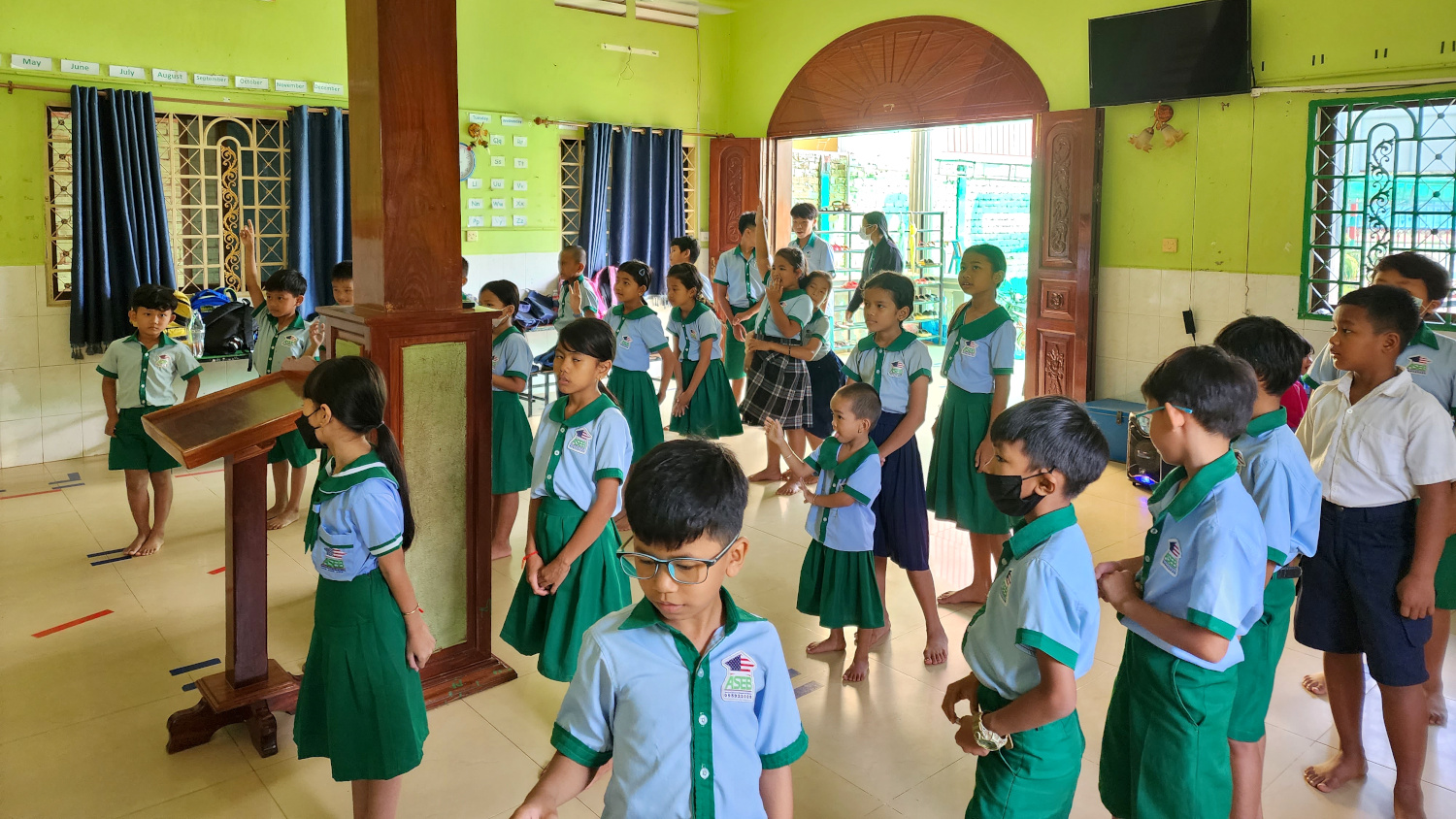 Cambodian schools follow a protocol that seems rather rigid by American standards. They assemble in formation in the morning and go through various rituals like the national anthem, and they also assemble in formation at the end of the day. But in between, the students may not be quite so orderly in class.