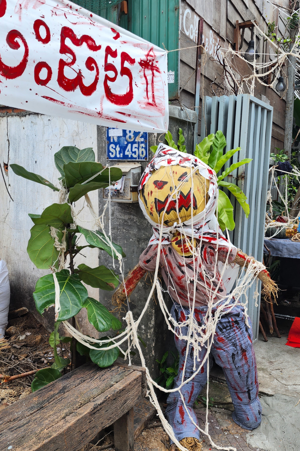 The lobby of the hostel included a little restaurant and bar; and the New Jersey dude offered us a free “Halloween cocktail”. Though normally we drink little to none, we thought why not. So he whipped up the concoction — we’re not sure just what all the ingredients were, but he added something to turn it blood red. And we “wolfed” it down, and had a very mellow settling-in on our first night ever in Vietnam.