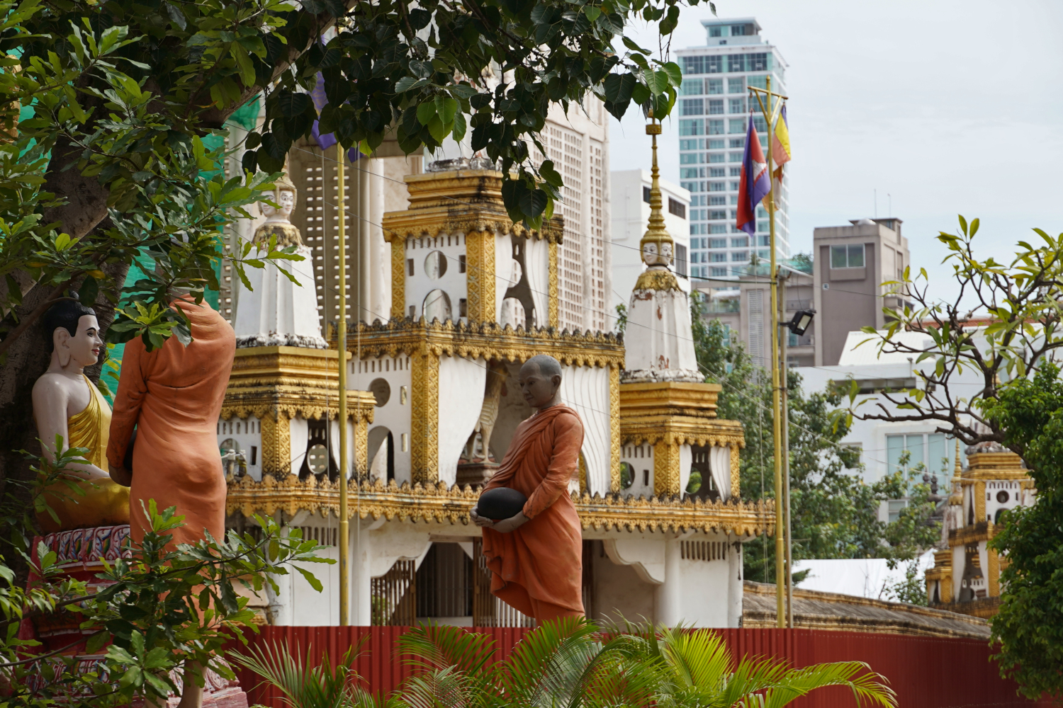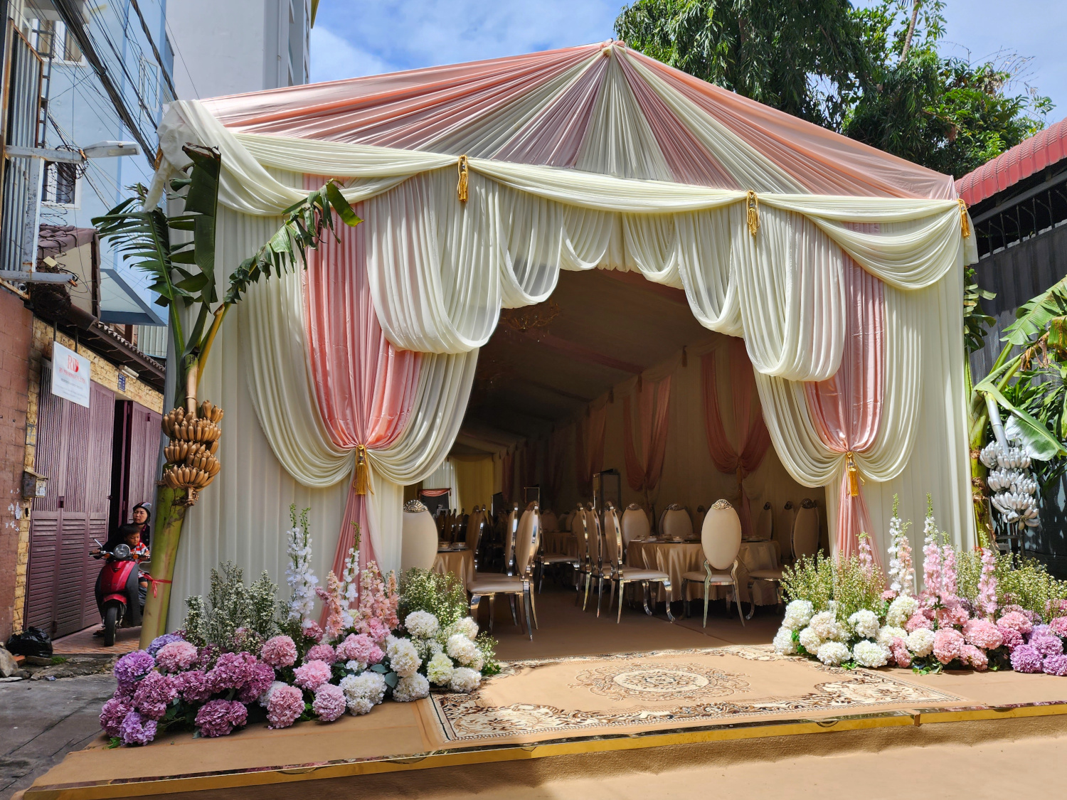 One thing that caught our eye was a catering tent erected for a wedding party in the street. This, we were to learn, is a routine occurrence in Cambodia, or at least in Phnom Penh. Since restaurants are generally cramped for space, they instead hold catered events in these tents in front. And out in the streets, which are already narrow and crowded enough, the various forms of traffic just make do and adjust as best they can.