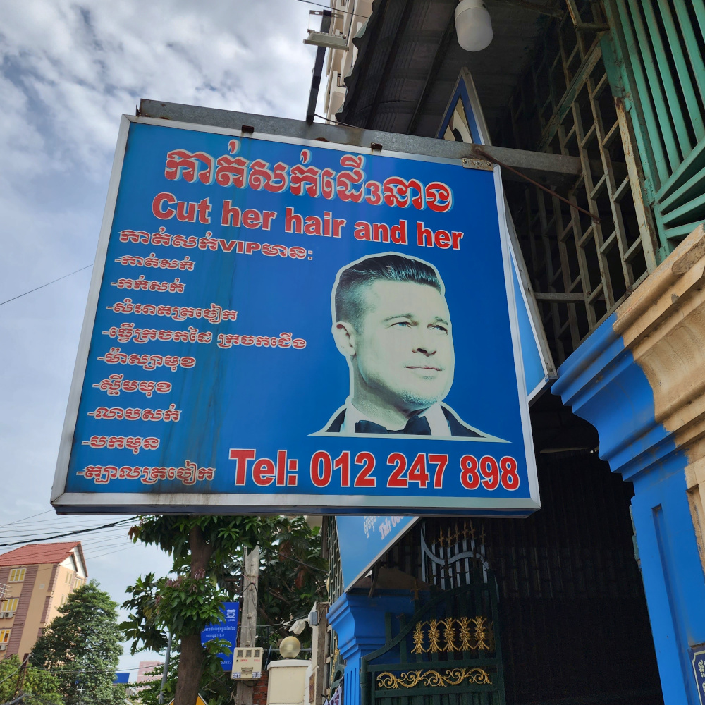 Signs around the neighborhood were mostly in Khmer, of course, but there was quite a bit of English sprinkled in Although the English wasn’t always exactly the King’s English. (“Cut her hair and her”???)