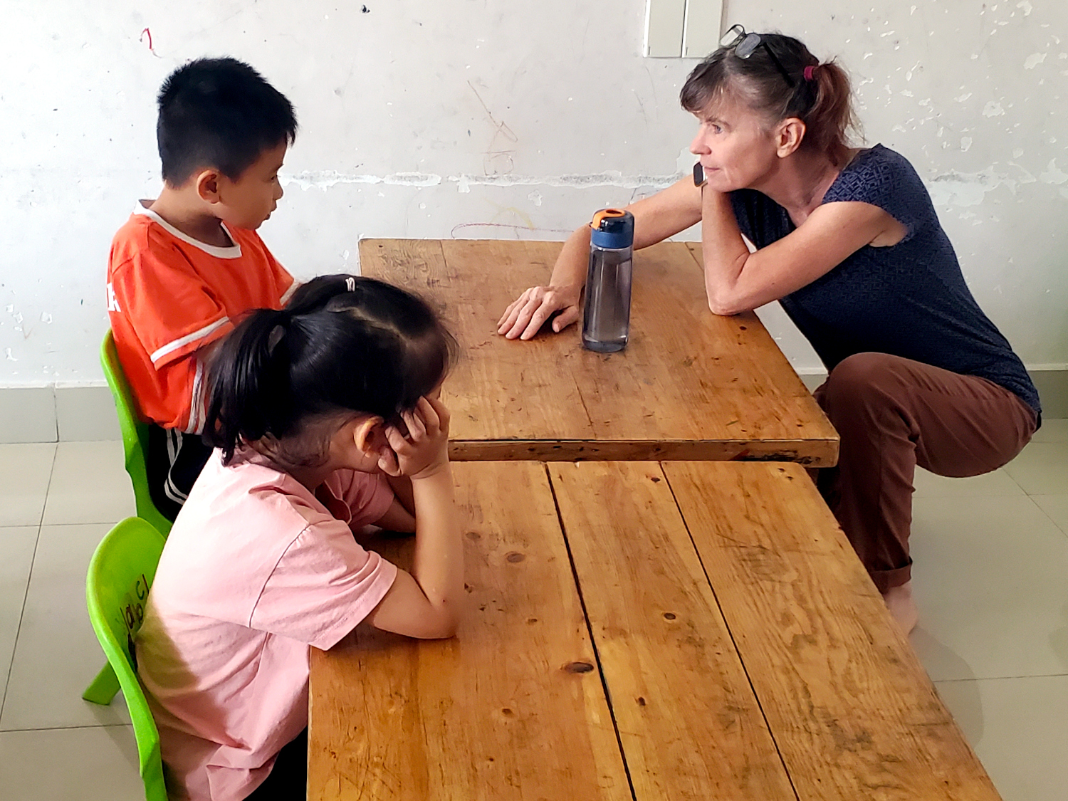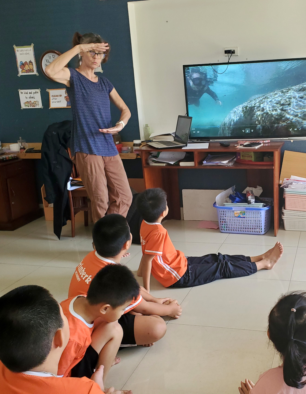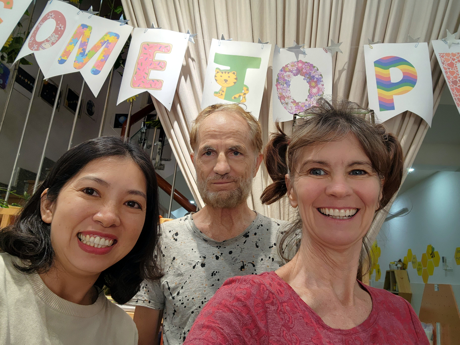 Meanwhile, we were getting acquainted with the students and having a lot of fun with them. One thing we did with them was introduce them to a little theatre. In particular, Kimberly presented her one-person version of Goldilocks and the Three Bears, which she developed years ago as an aid to teaching sign language, as she performs it with no dialogue and encourages the audience to fill in the dialogue. It was always a big hit in the U.S., and it has been in other countries where we’ve tried it out too — including here in Vietnam.