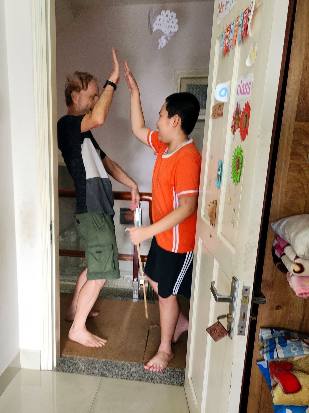 All too soon, we came to the end of our brief stay at the school in Hoi An, and we participated once more in the little greeting ritual the students indulged in every morning. When they first enter the classroom, they select their choice of greetings to exchange with the teacher. It could be a high five, a hug, a fist bump, or one of several other gestures, one of which resulted in a bear hug for Dennis. Such a simple little thing, but so effective in getting the students in the right frame of mind, perking them up, and offering them a measure of autonomy at the same time.