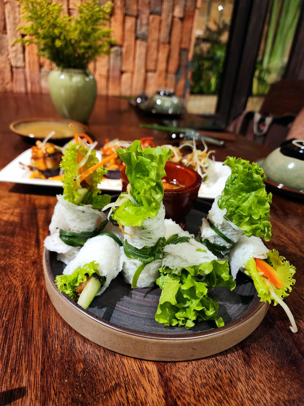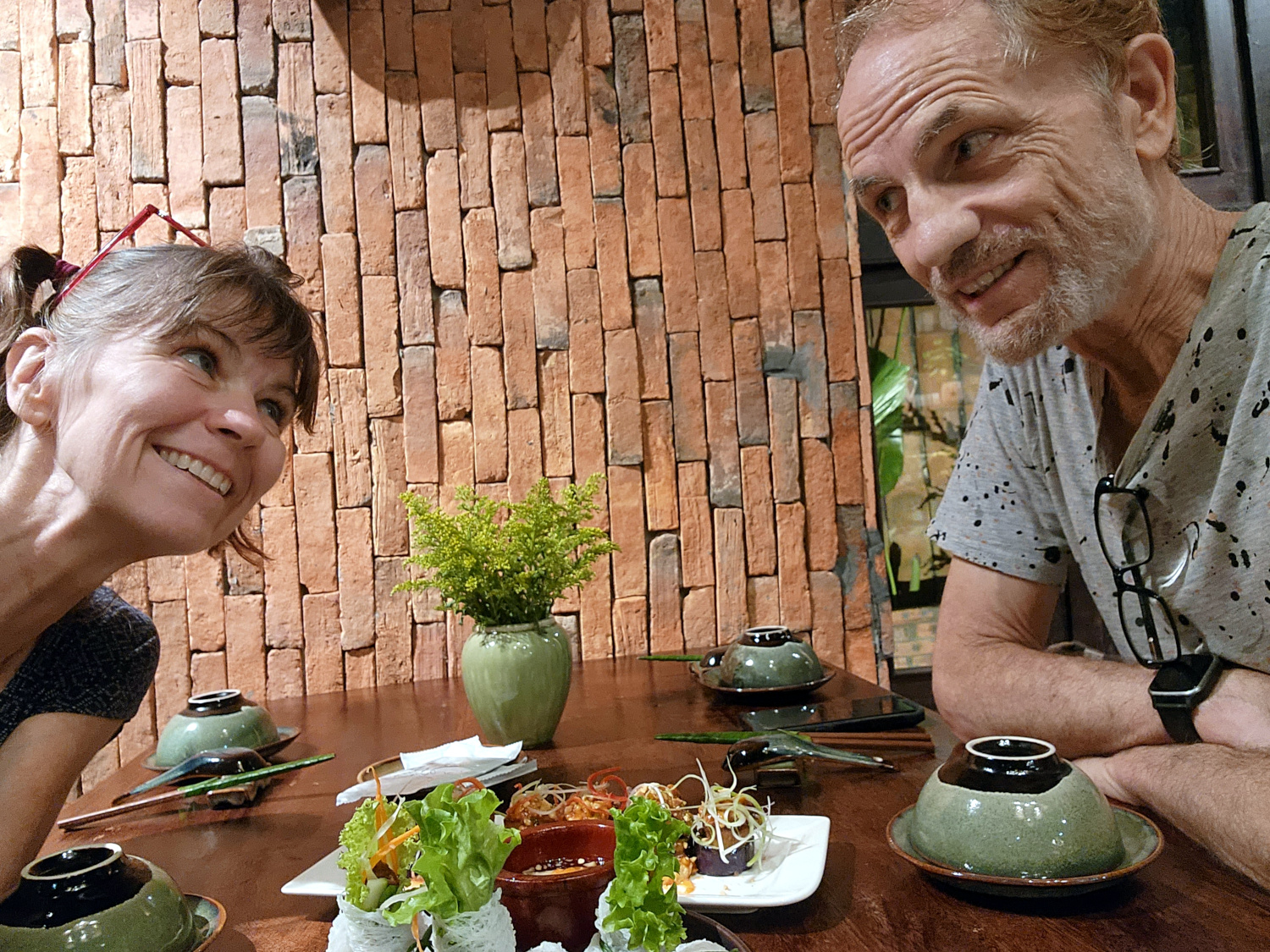 Especially since preparing meals at the hostel was such a hassle, we decided to eat dinner out. And we stumbled upon the ideal restaurant to give us a great sampling of Vietnamese cuisine. The decor and atmosphere were enticing– including a walkway through a little garden at the entrance. But the food was even better: imaginative, colorful, and absolutely delicious. And the price was extremely reasonable. Our only objection was that the portions were rather meager; so we solved that problem by just ordering more. And we also returned the next night to try other items on the menu.