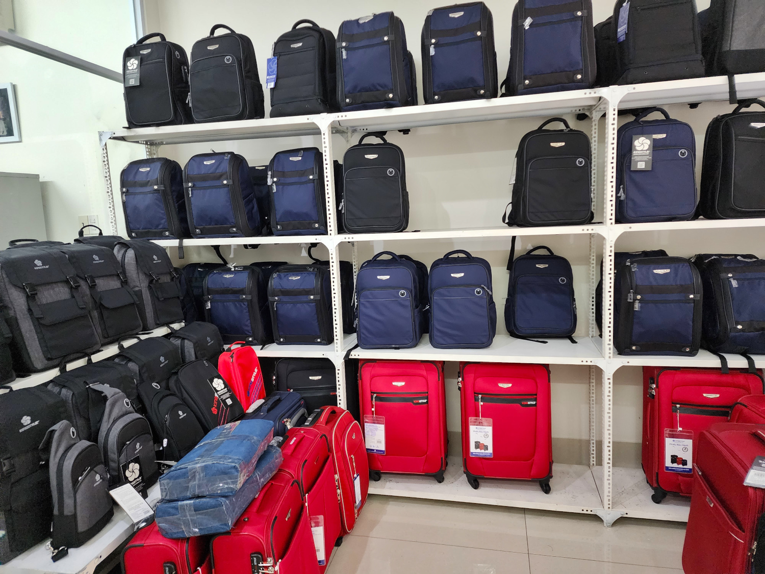 After some online research and map sleuthing, we found an outlet for various kinds of baggage and baggery at the home of a company that actually manufactures them. The lobby had an impressive selection for sale to the public. (We were hoping to actually get back in the back and watch the elves assemble the product, but apparently that would have been against safety regulations or some such.) We did however get a chance to have a friendly chat with the manager. This company, by the way, also manufactures luggage for Samsonite. So it’s surely high quality workmanship. And its own brand goes on the same kind of product – for, no doubt, considerably less cash.