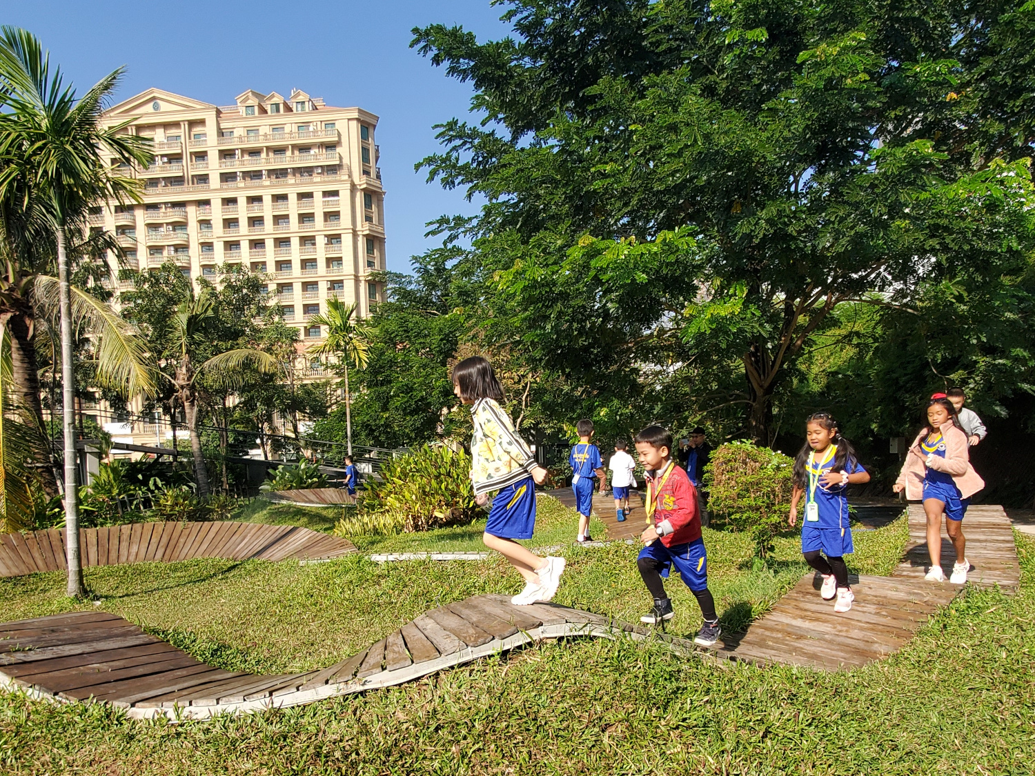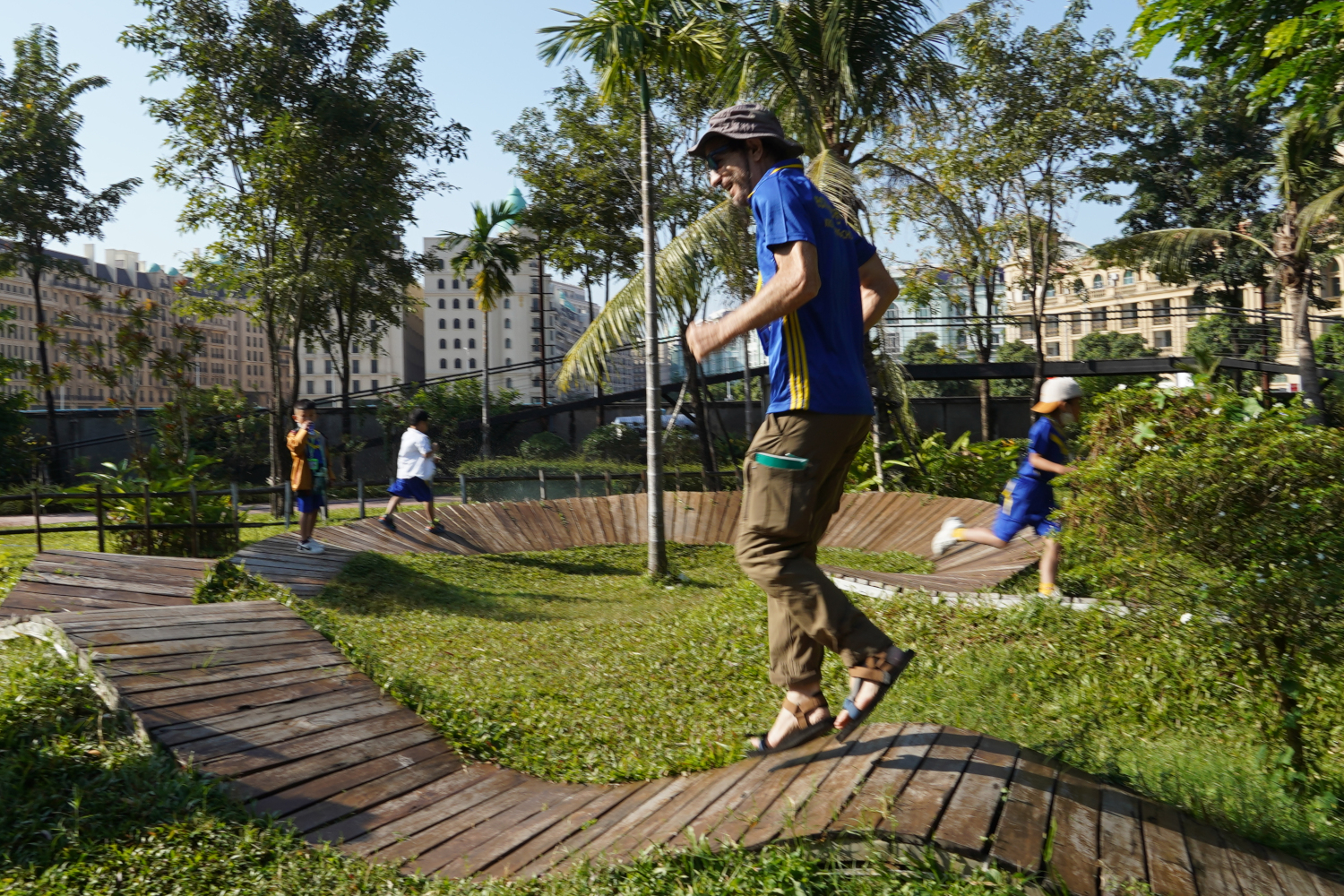 The most fun feature of the park that we saw was a walkway — though it was treated more like a runway — made of wooden planks, that was very twisted and rolling, so that making your way around it, especially with a little speed, made the kids giddily off-balance. Well, some of the adults too.