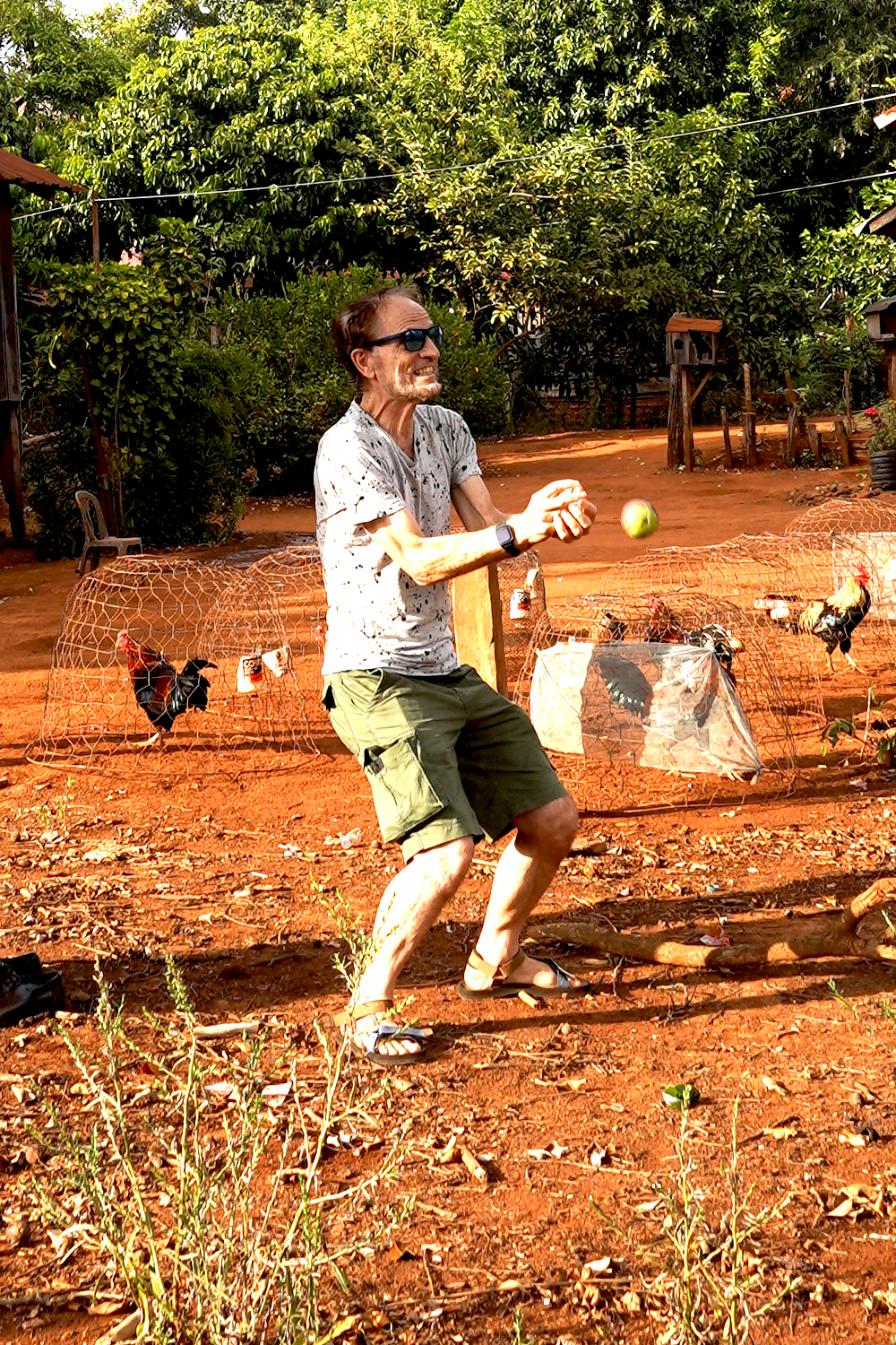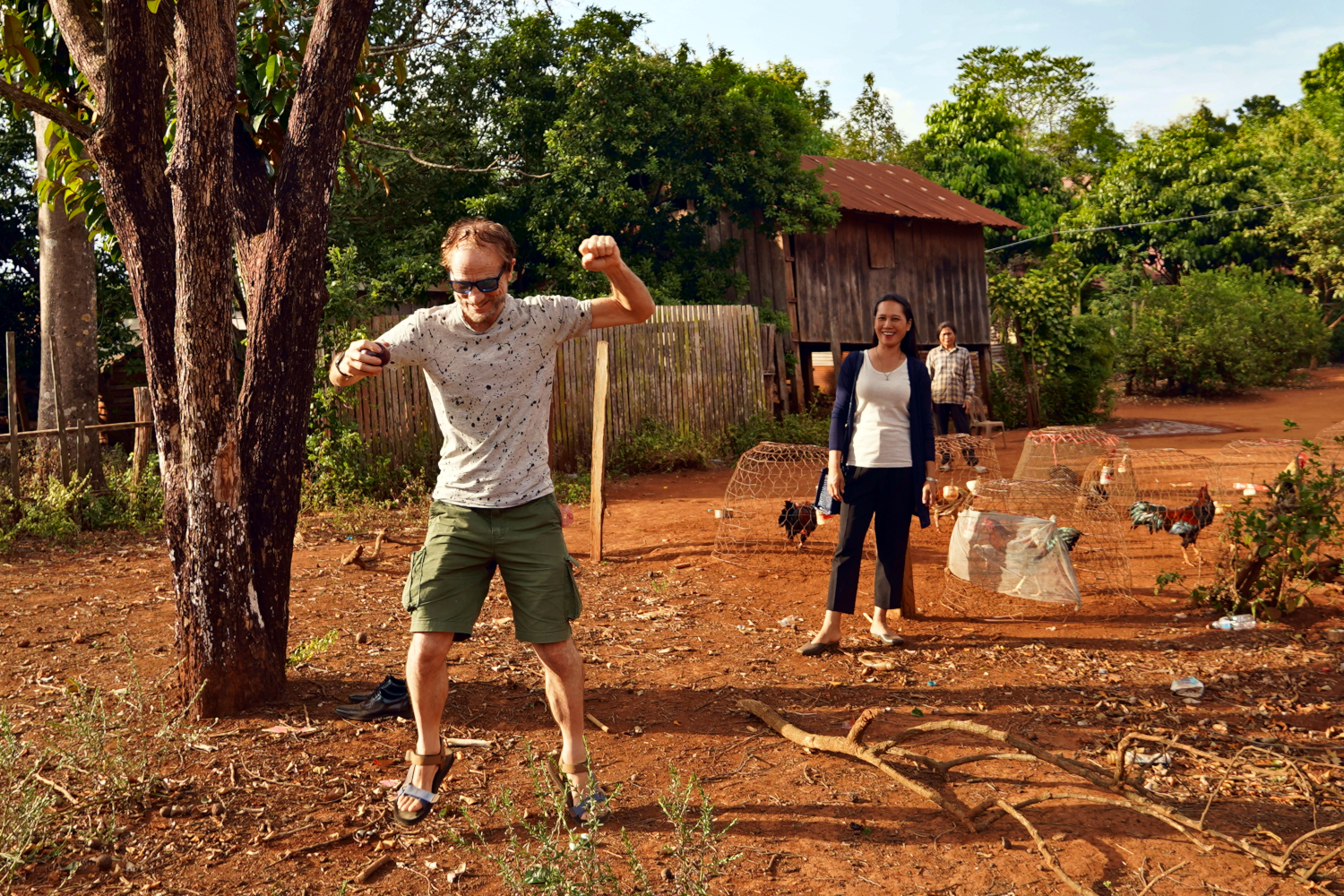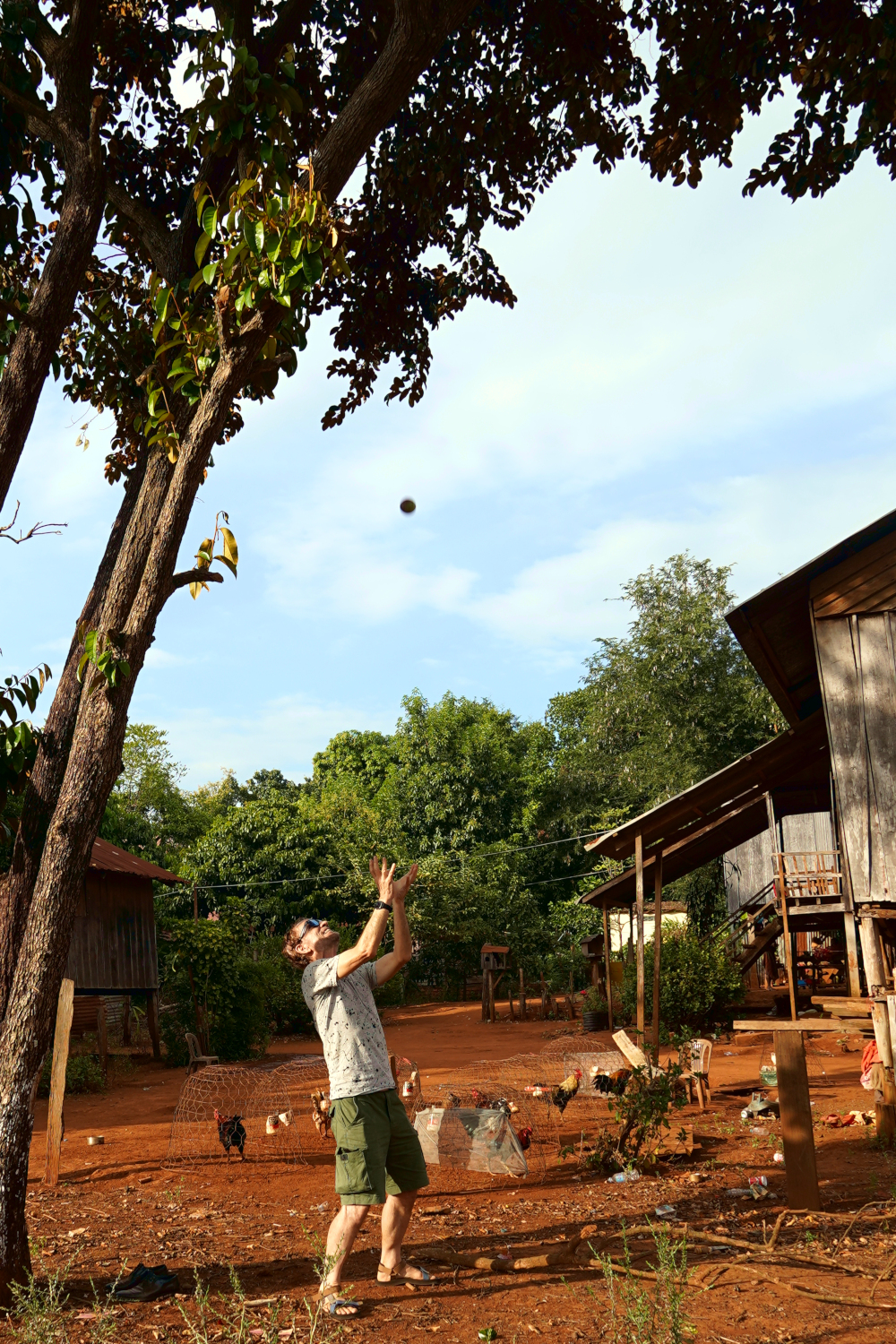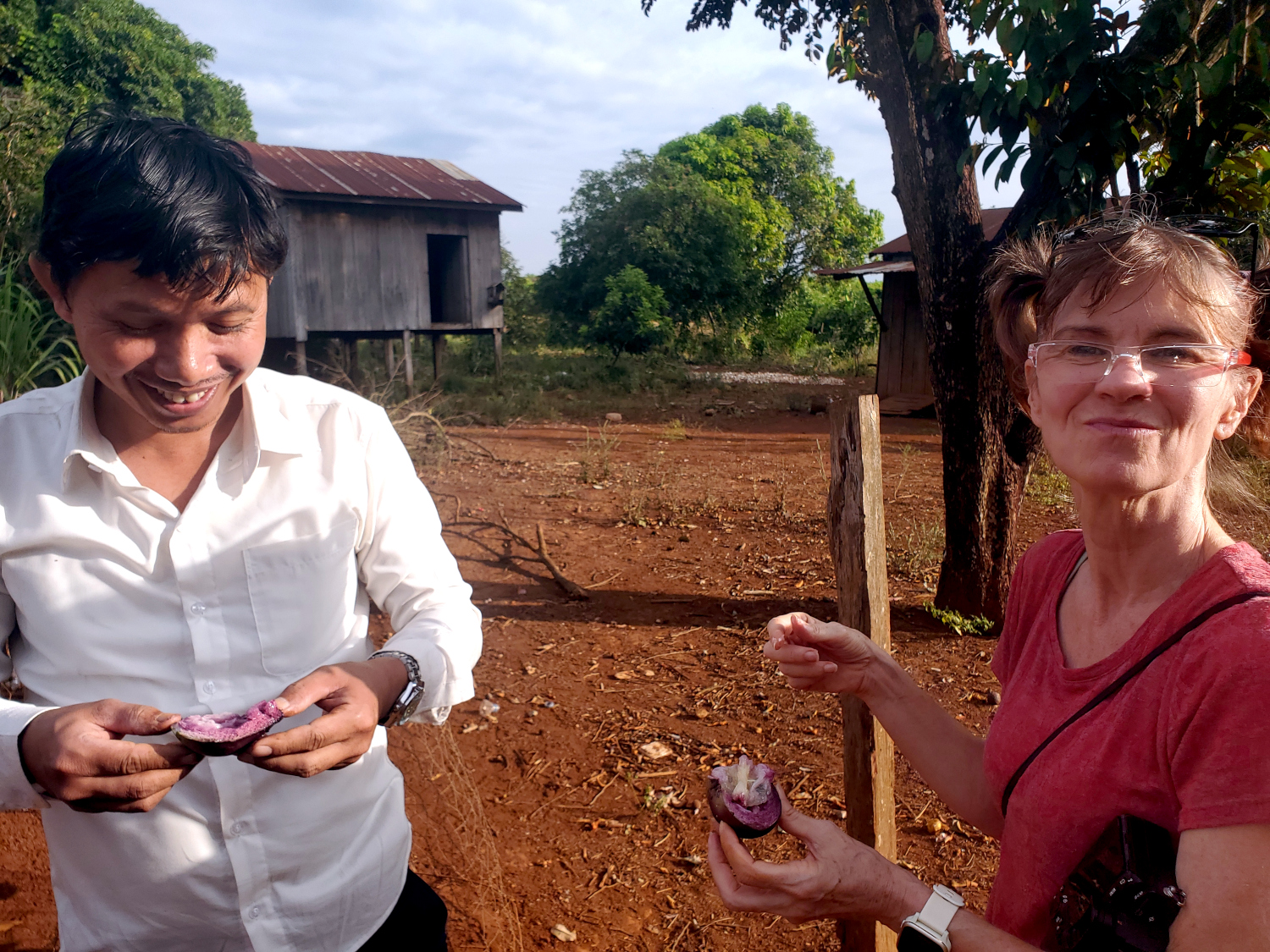 Beside Kompheak’s old homestead was a tall, sturdy tree that he identified as a milkfruit tree. He climbed up into it with ease, and threw down some of the fruit, which we did our best to catch, with limited success. We had heard of milkfruit, but were not terribly familiar with it, and can’t say that we’d ever tried eating it. But on this day we did. And our verdict? Well.. it’s not bad if you’re hungry.