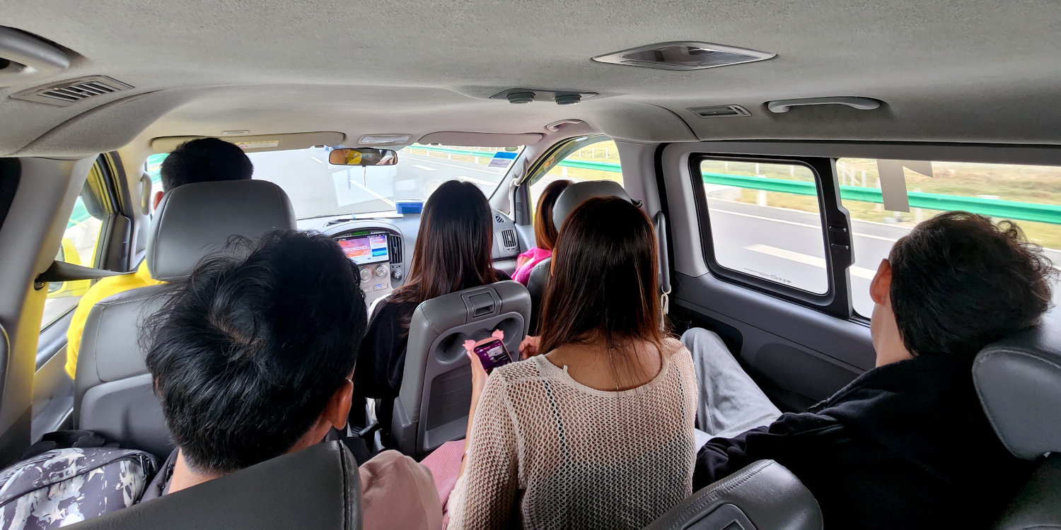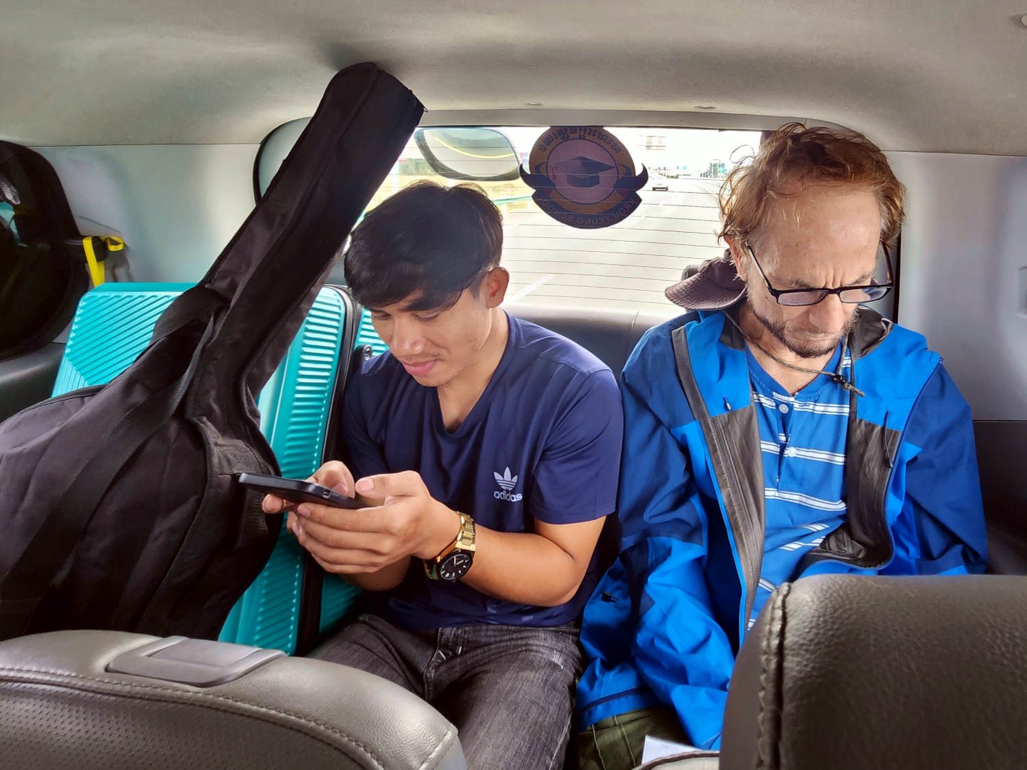 It’s standard procedure in Cambodia to stuff as many bodies as possible into a vehicle, even for a long ride like ours; evidently you’re not supposed to breathe while traveling. So it would have been crowded enough already, without any personal items. Meanwhile, the music teacher brought along his guitar, which was excusable enough; but that in addition to the other teacher’s gargantuan bag made the back seat something approaching the conditions of a medieval torture chamber.