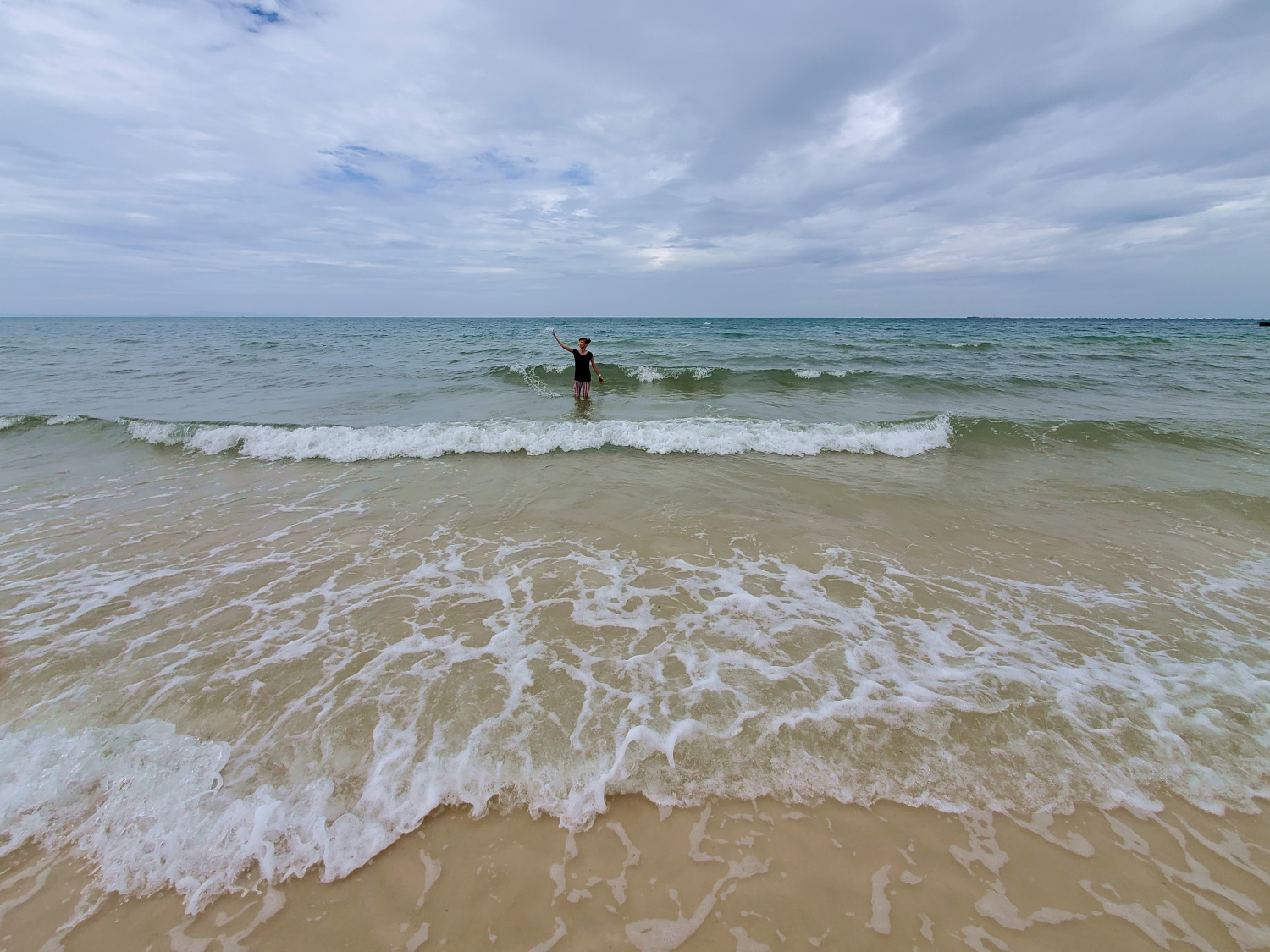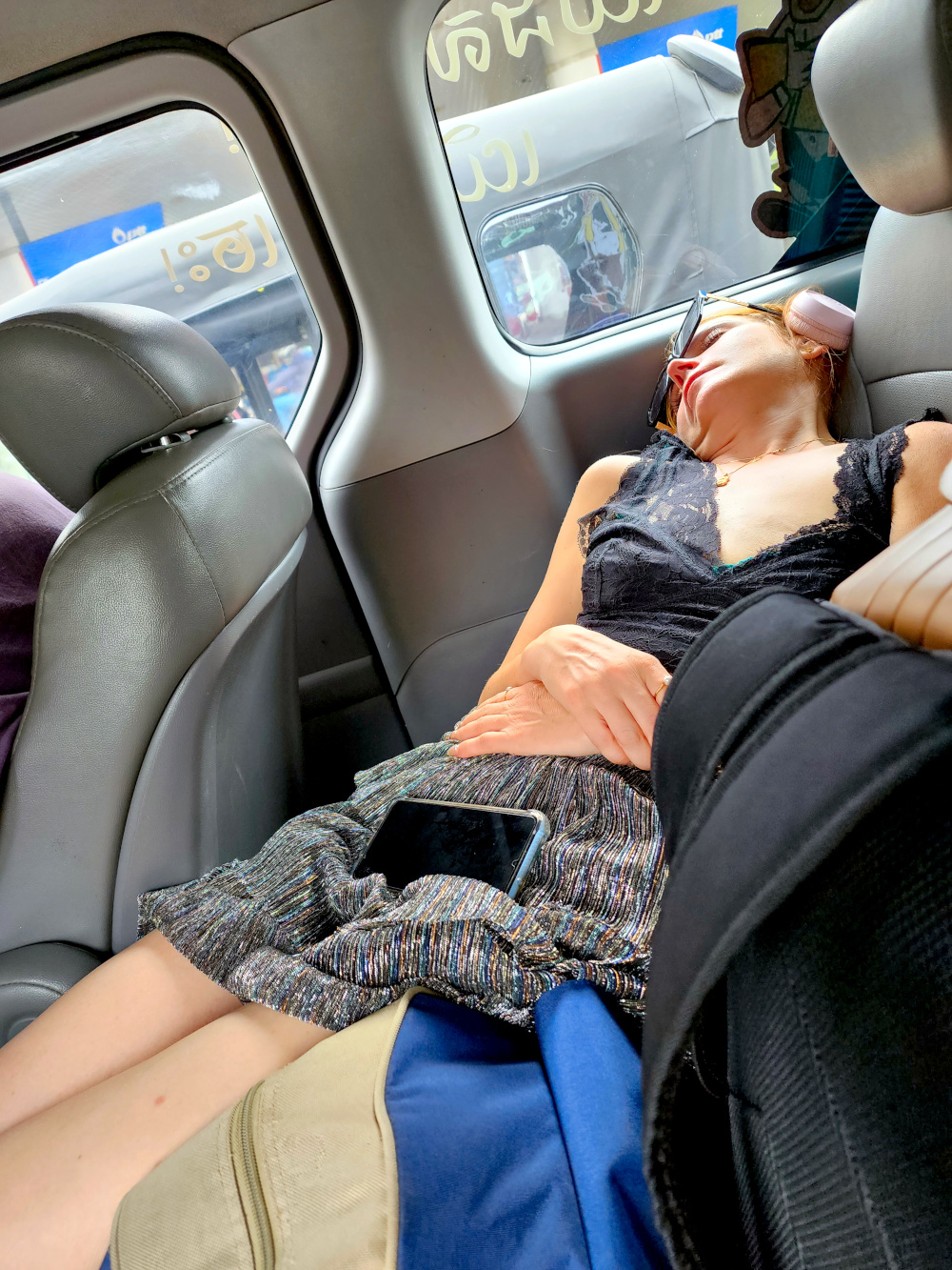 When we heard about this trip, we secretly hoped that she wouldn’t be going with us. But after we reported to the school at 6:00 on Saturday morning to wait for the van to be ready and all the passengers to arrive, lo and behold, it wasn’t long before she showed up too — in a tuk-tuk, for which she tried to get the school to pay the fare, since she conveniently didn’t carry cash. She was toting a huge suitcase, along with other bags. It seems she’d brought along four pairs of heels (for an overnight trip to the beach) as well as several bathing suits (she never went in the water) and who knows what else. She also claimed to have 8 cell phones; we don’t know how many she brought with her, but she thought (incorrectly) she’d left one back at the school after we’d departed, which almost caused us to turn back to try to find it.