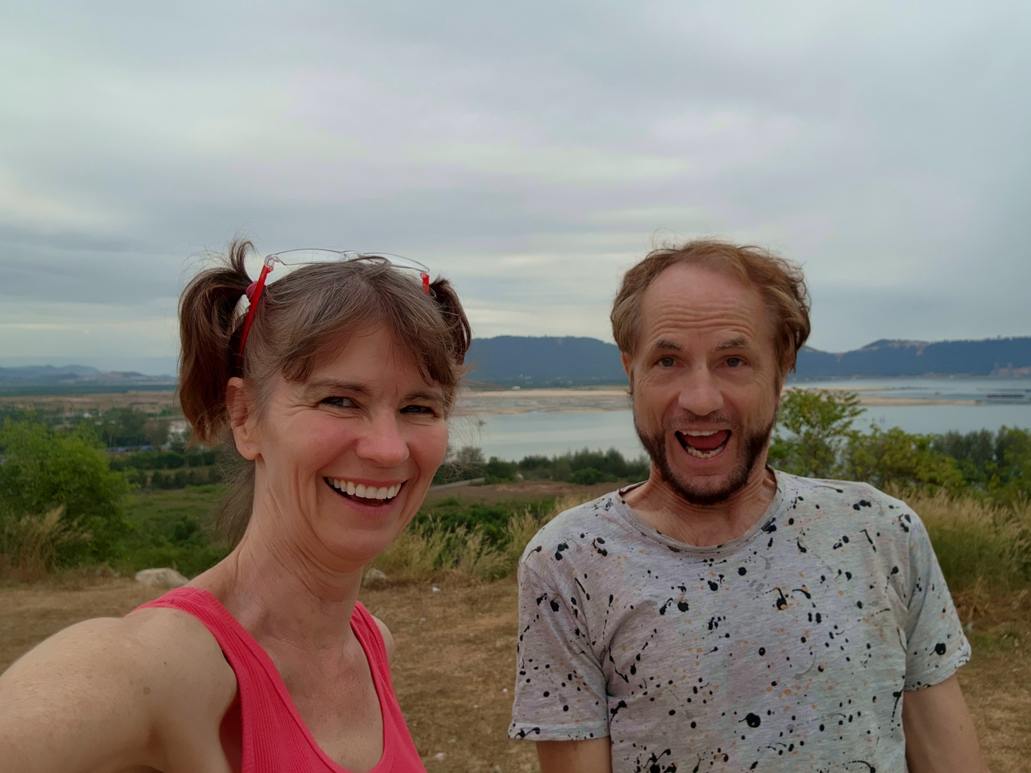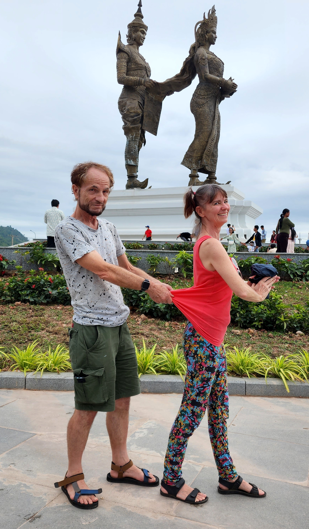 According to tradition, Preah Thong was a prince who came from India and fell in love with Neang Neak, who was a sea serpent that had been transformed into a princess. He journeyed with her to her underwater home to ask her father, the king of the sea serpents for her hand — or scales — in marriage. At their wedding, he carried her serpent’s tail in the procession; accordingly, it has become the Cambodian custom for the groom to carry the bride’s train, as depicted in this sculpture. Naturally, we had to pose with the statue in the same gesture.